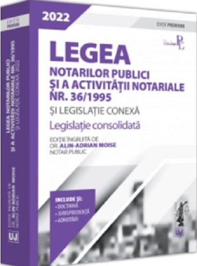 Ingrijita de dr. Alin-Adrian Moise, notar public (Camera notarilor publici Bucuresti) si formator la Institutul Notarial Roman, culegerea Legea notarilor publici si a activitatii notariale nr. 36/1995 si legislatie conexa 2022 (actualizata la data de 17 iulie 2022) deschide seria editiilor PREMIUM din acest an.