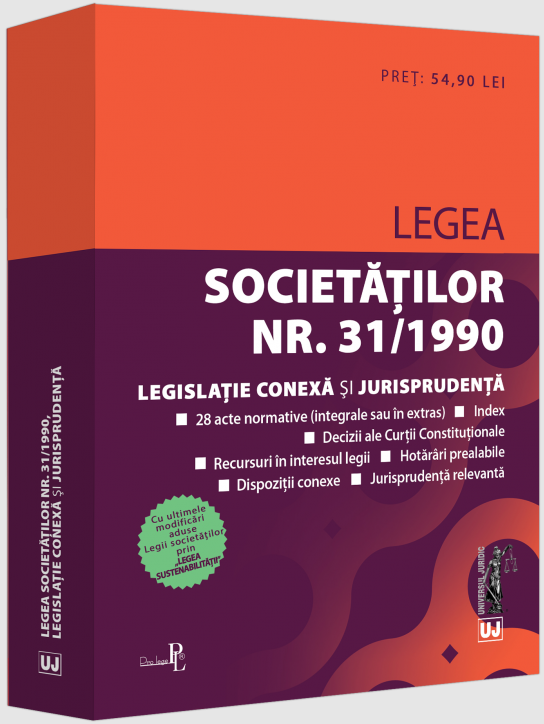 Editia a 9-a (revizuita) a culegerii, Legea societatilor nr. 31/1990, legislatie conexa si jurisprudenta, tiparita pe hartie alba de calitate superioara, contine: Legea societatilor nr. 31/1990 (cu un index concis, dar relevant, si cu noile modificari aduse prin „Legea sustenabilitatii”); alte 27 acte normative (integrale sau in extras), importante pentru domeniul comercial (inclusiv Legea registrului comertului nr. 265/2022 si O. U. G. nr. 44/2008 privind persoanele fizice autorizate); decizii ale Curtii Constitutionale; recursuri in interesul legii; hotarari prealabile; numeroase dispozitii conexe (scurte extrase din acte normative incidente); jurisprudenta (atent selectata); alte interventii redactionale utile.