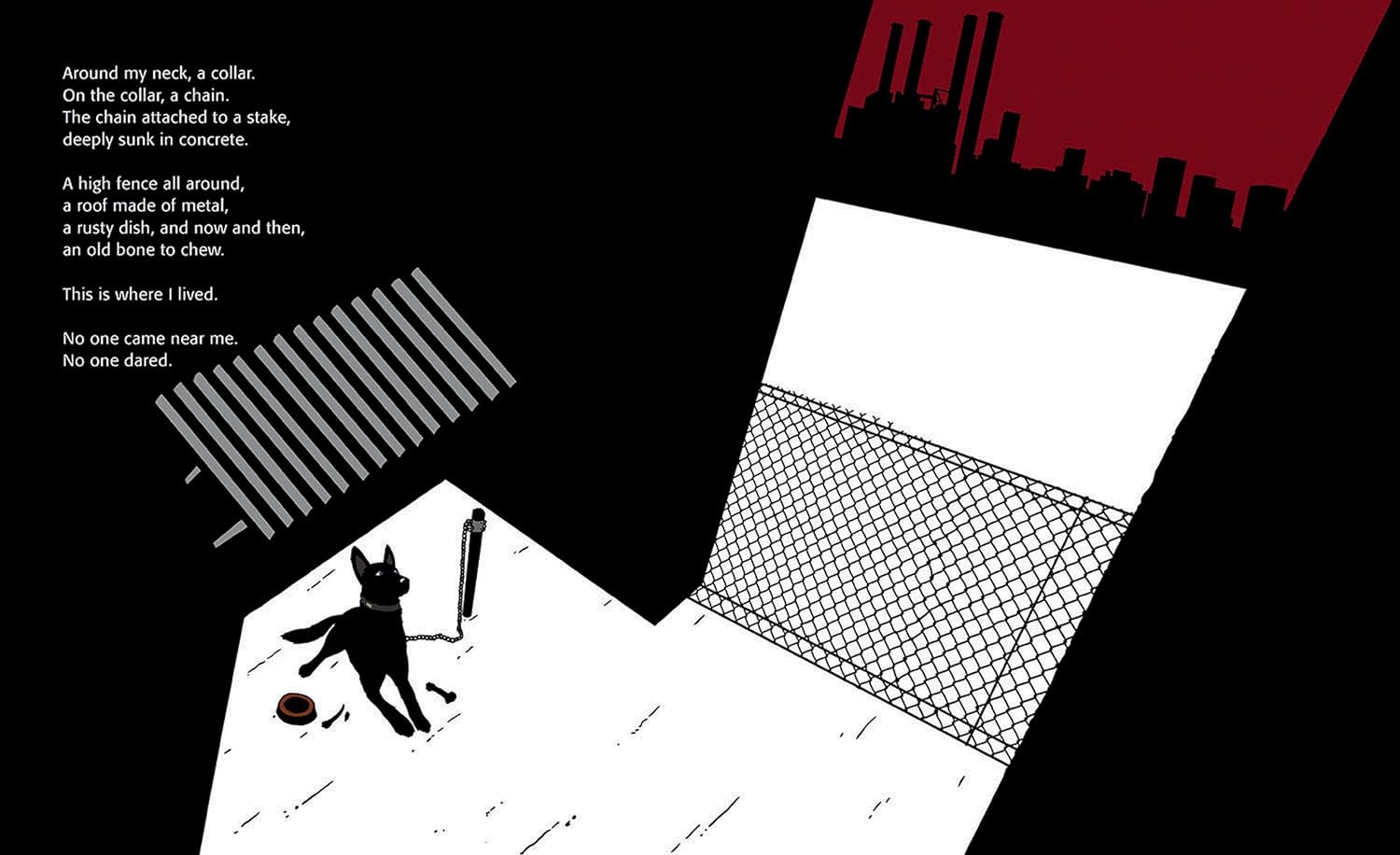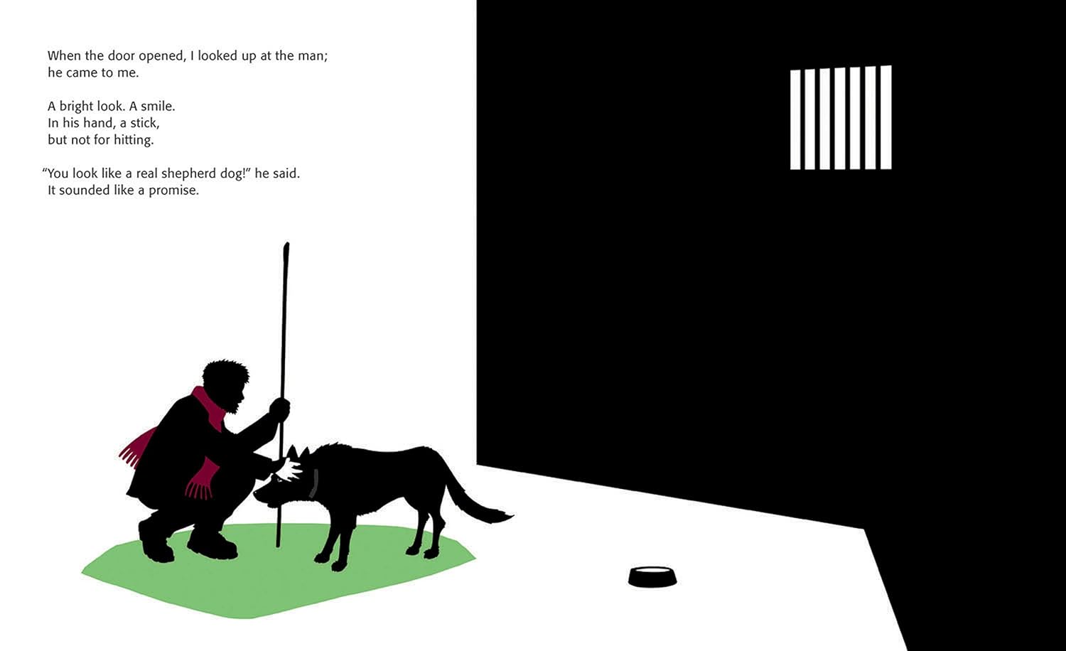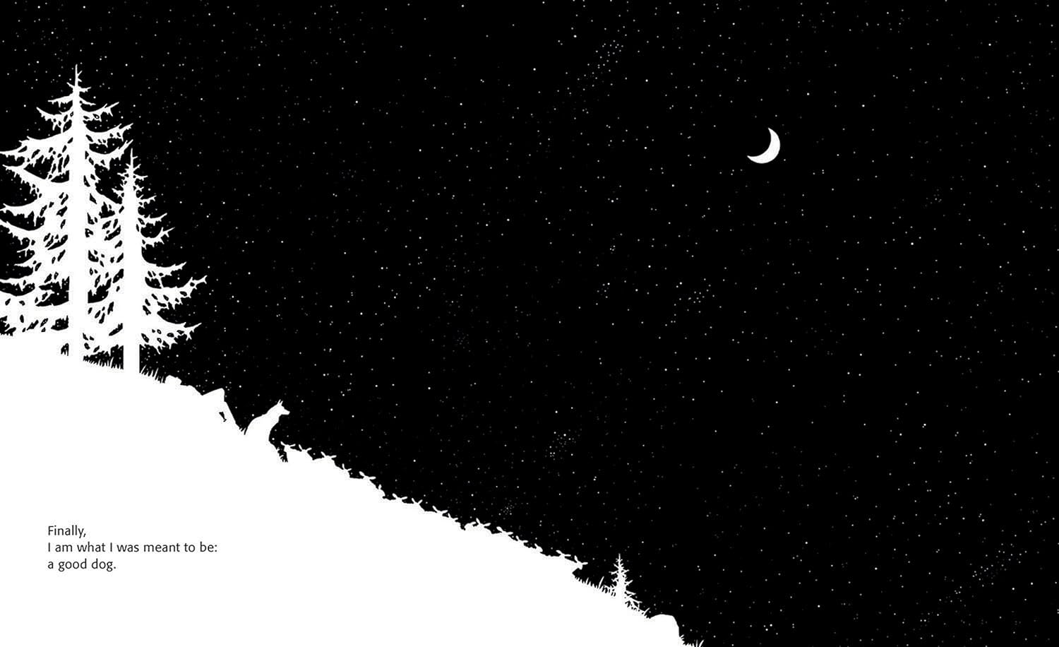 A sad and lonely dog, chained to a concrete slab by an abusive owner, tells how his wolf-like appearance and nighttime howling has led humans in the city neighborhood to misunderstand him. He longs for the freedom to run and the touch of a friendly hand. Taken to an animal shelter, the abandoned dog loses hope of being rescued until a man carrying a long, thin stick reaches through the bars to pat him on his back and says, "You look like a real shepherd dog!" Now, the dog reports, he spends his days tending sheep in the fields and his nights beside his shepherd, singing to the moon. Black-and-white silhouette illustrations dramatically show the transformation of this mistreated dog, whose life is changed by one caring individual.