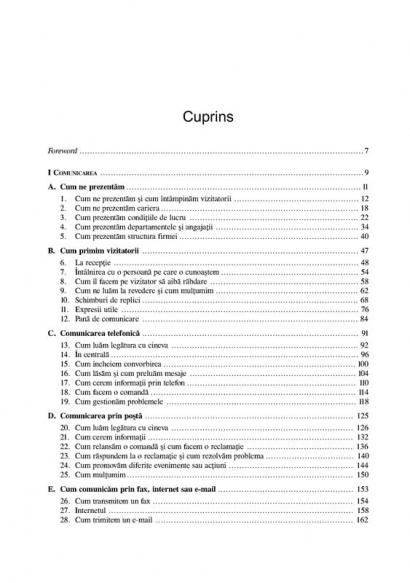 Adresata celor care au deja cunostinte fundamentale de limba engleza, lucrarea este structurata tematic (cum ne prezentam, convorbirea telefonica, cum scriem o scrisoare/un e-mail, negocierea, organizarea intilnirilor de afaceri etc.) si contine numeroase informatii practice.