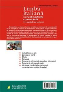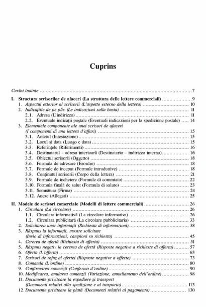Cuprins: Indicatiile de pe plic • Elementele componente ale unei scrisori comerciale • Cererea de oferta • Oferta • Comanda • Documente privitoare la expediere si transport • Documente privitoare la plata • Mic glosar roman-italian de termeni comerciali, economici si financiari