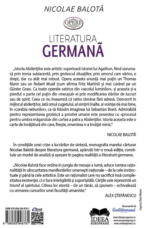 În condiţiile unei crize a lucrărilor de sinteză, monografia marelui cărturar Nicolae Balotă despre literatura germană, apărută într-o nouă ediție, constituie un model de analiză și așezare în pagina realității a literaturii germane.