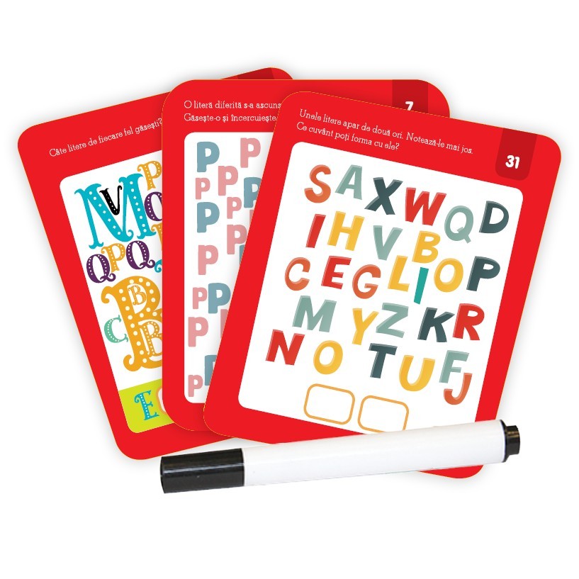 Cele 40 de fișe refolosibile antrenează spiritul de observație, dar în același timp, copilul își dezvoltă și motricitatea fină, exersând ținerea corectă a instrumentului de scris. În plus, tematica aleasă îl ajută să recapituleze literele alfabetului.