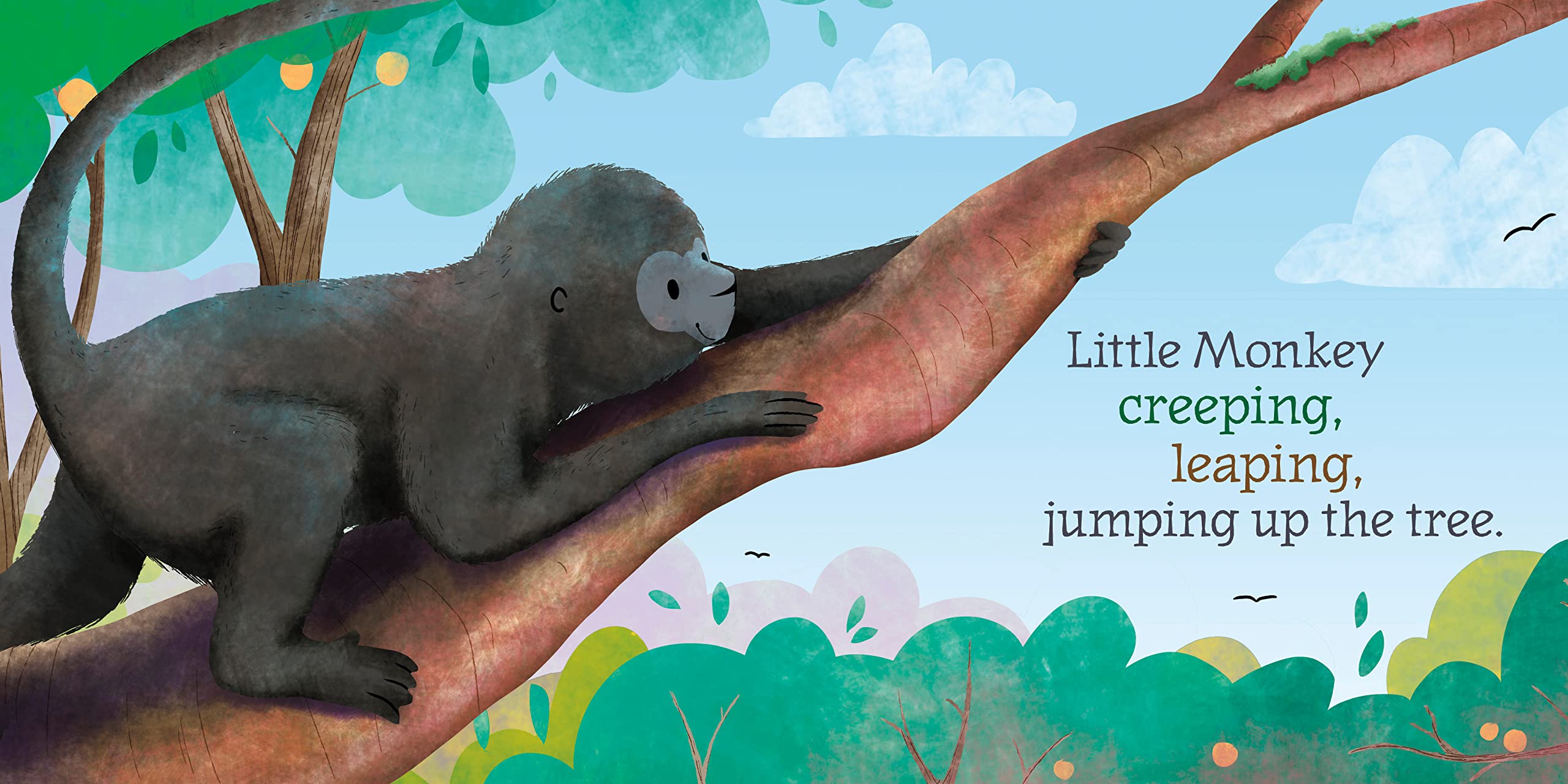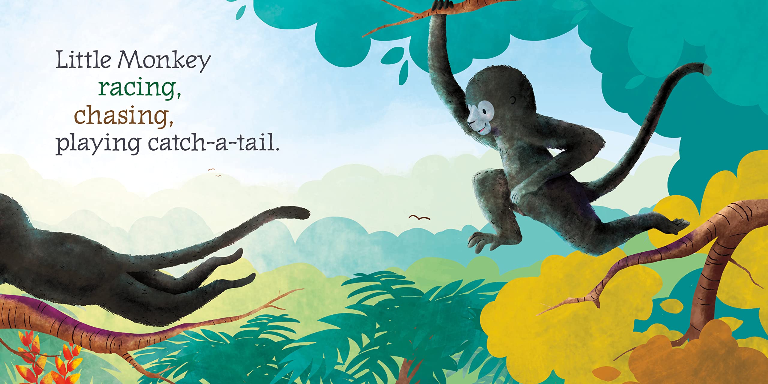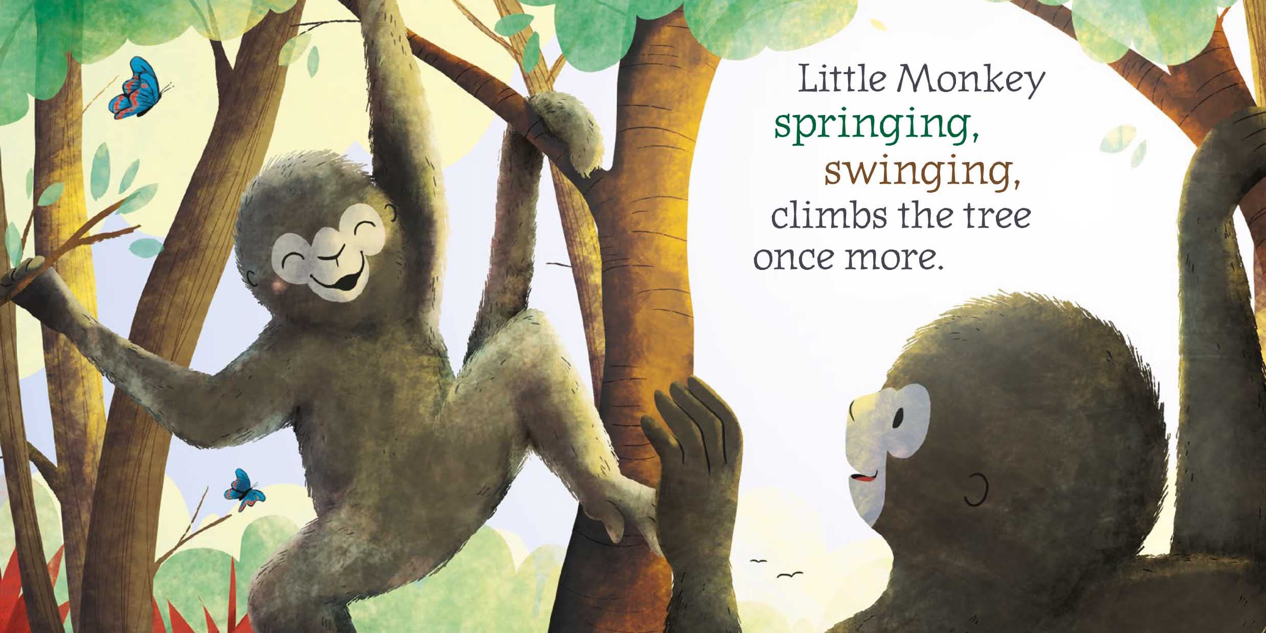 Little Monkey swings through the jungle until--Oops!--he falls out of a tree. Mama catches him and comforts him and all becomes right again. A sweet story of youthful adventure and motherly love, told with short rhyming lines and warm illustrations.