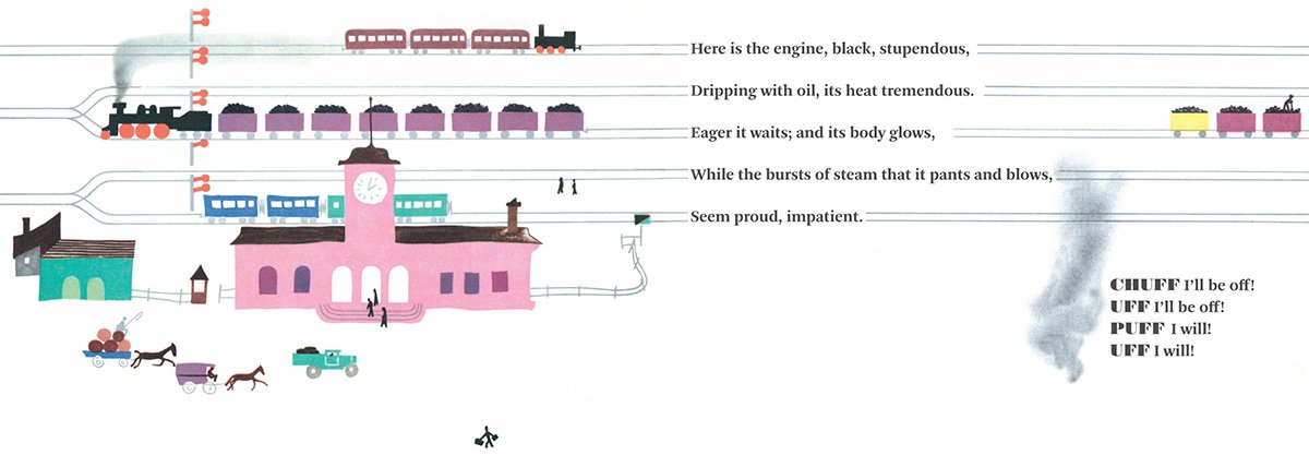 Tuwim's rhythmic poem Locomotive invites us aboard an old steam train as it chuffs and puffs out of the station. As it races along, rattling and clattering past bridges and valleys, we look inside some of the train's many carriages. There's a wagon of bananas, one full of pianos, another is carrying animals off to the zoo, there are giraffes and elephants and bicycles and umbrellas, and a trio of men, all eating sausages. Le Witt and Him's illustrations capture inventively the smoke and the speed and the humorous cargo.