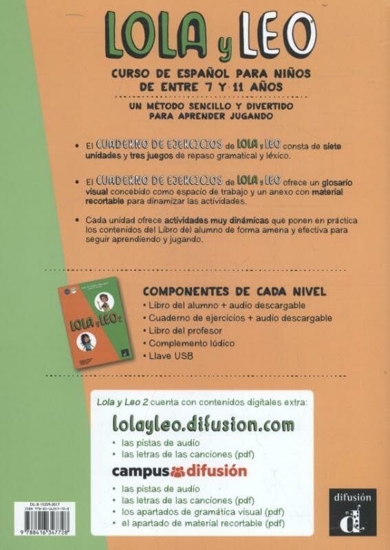 El Cuaderno de ejercicios de Lola y Leo consta de siete unidades y tres juegos de repaso gramatical y léxico. El Cuaderno de ejercicios de Lola y Leo ofrece un glosario visual concebido como espacio de trabajo y un anexo con material recortable para dinamizar Ias actividades. Cada unidad ofrece actividades muy dinámicas que ponen en práctica los contenidos del Libro del alumno de forma amena y efectiva para seguir aprendiendo y jugando.