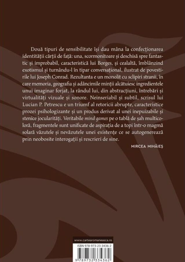 Scrisul lui Lucian P. Petrescu e un triumf al retoricii abrupte„Două tipuri de sensibilitate își dau mâna la confecționarea identității cărții de față: una, scormonitoare și deschisă spre fantastic și improbabil, caracteristică lui Borges, și cealaltă, îmblânzind exotismul și turnându-l în tipar conversațional, ilustrat de povestirile lui Joseph Conrad.