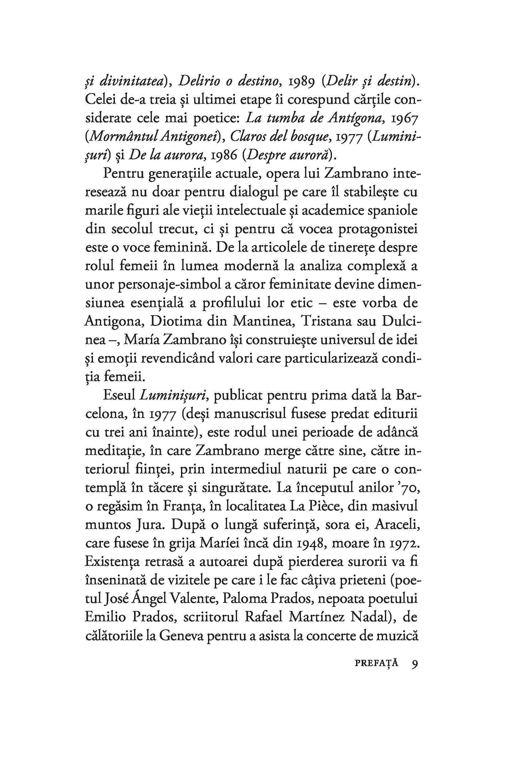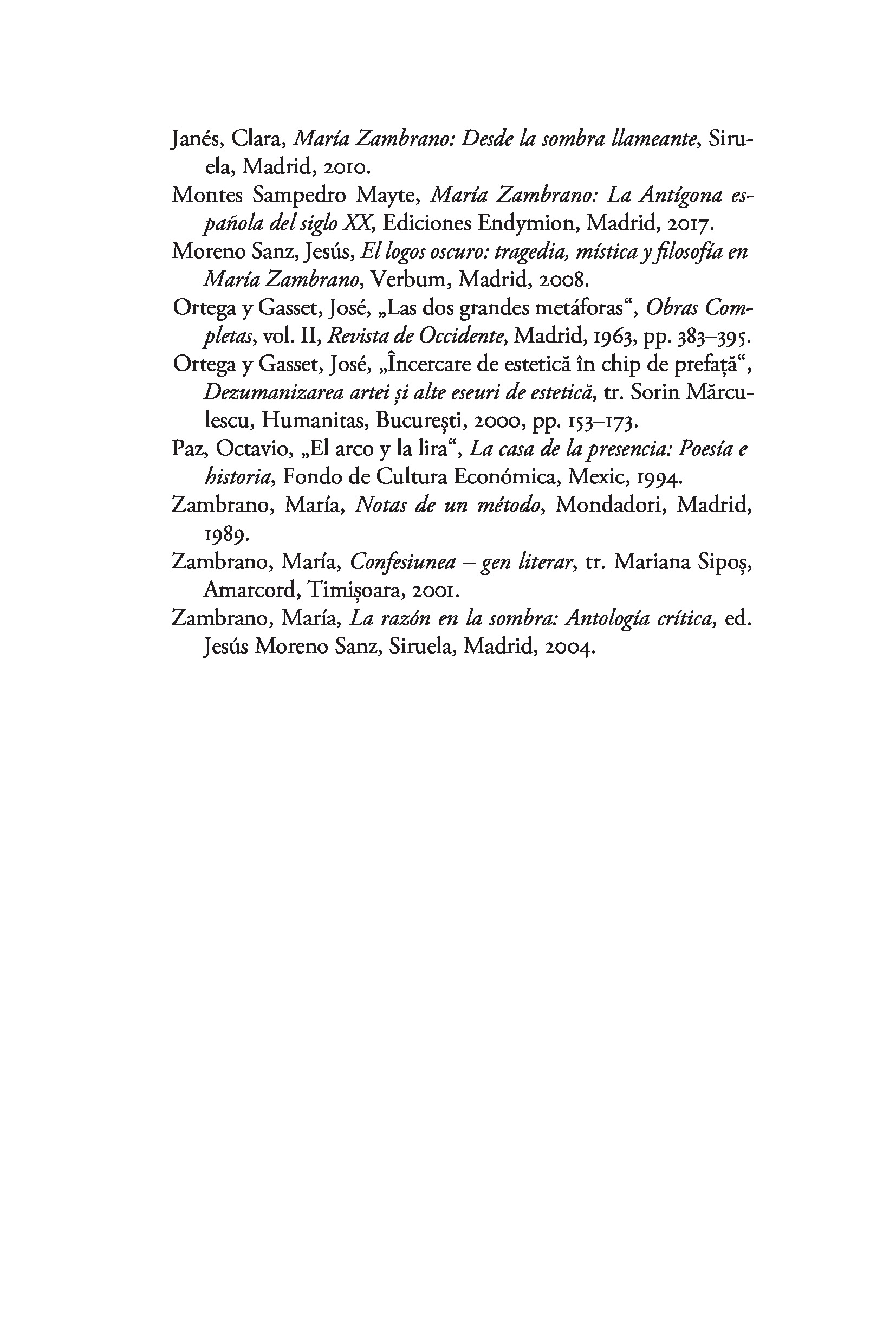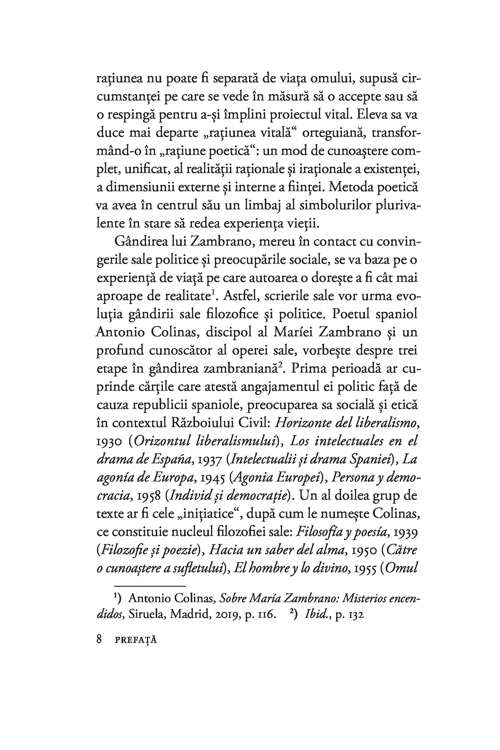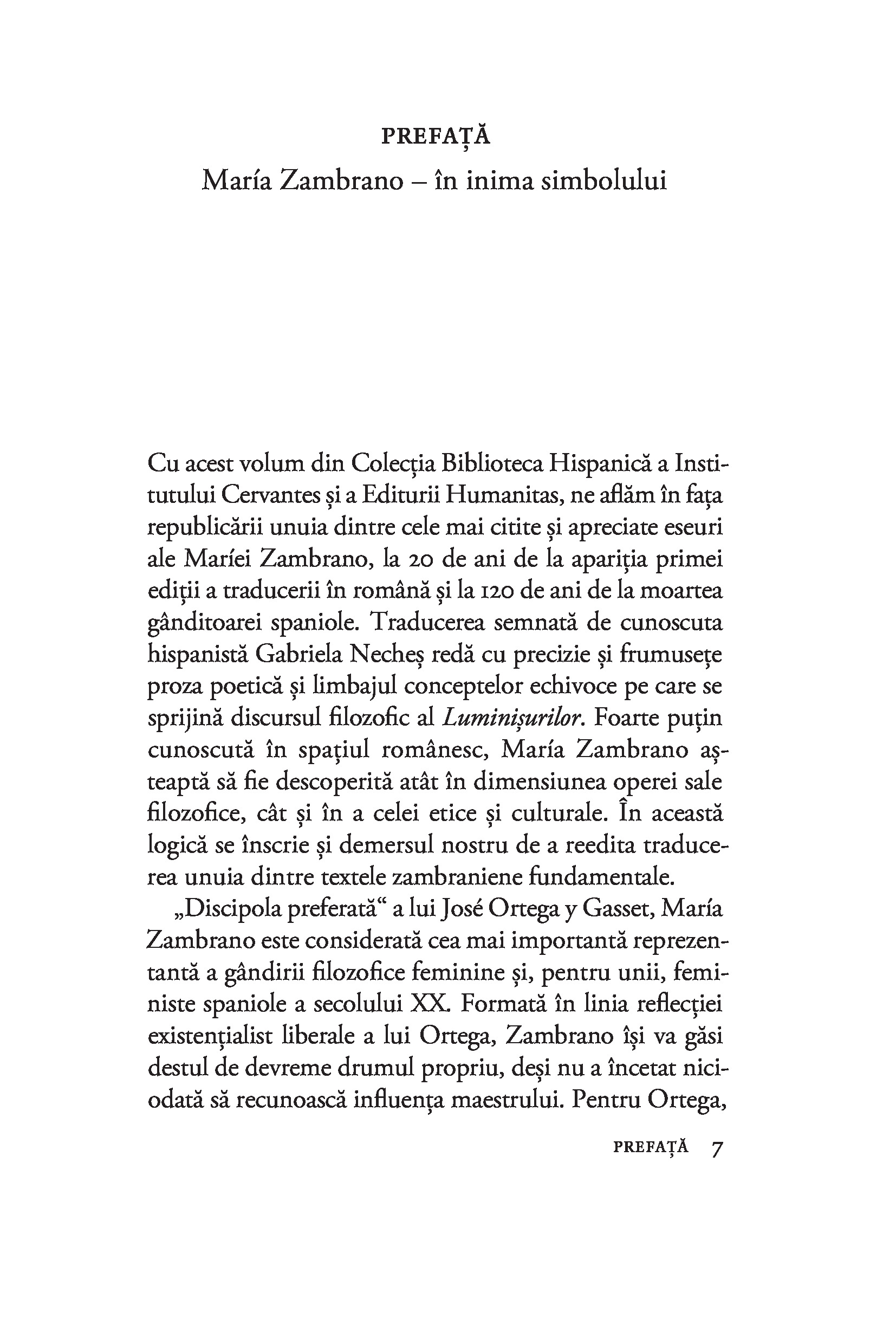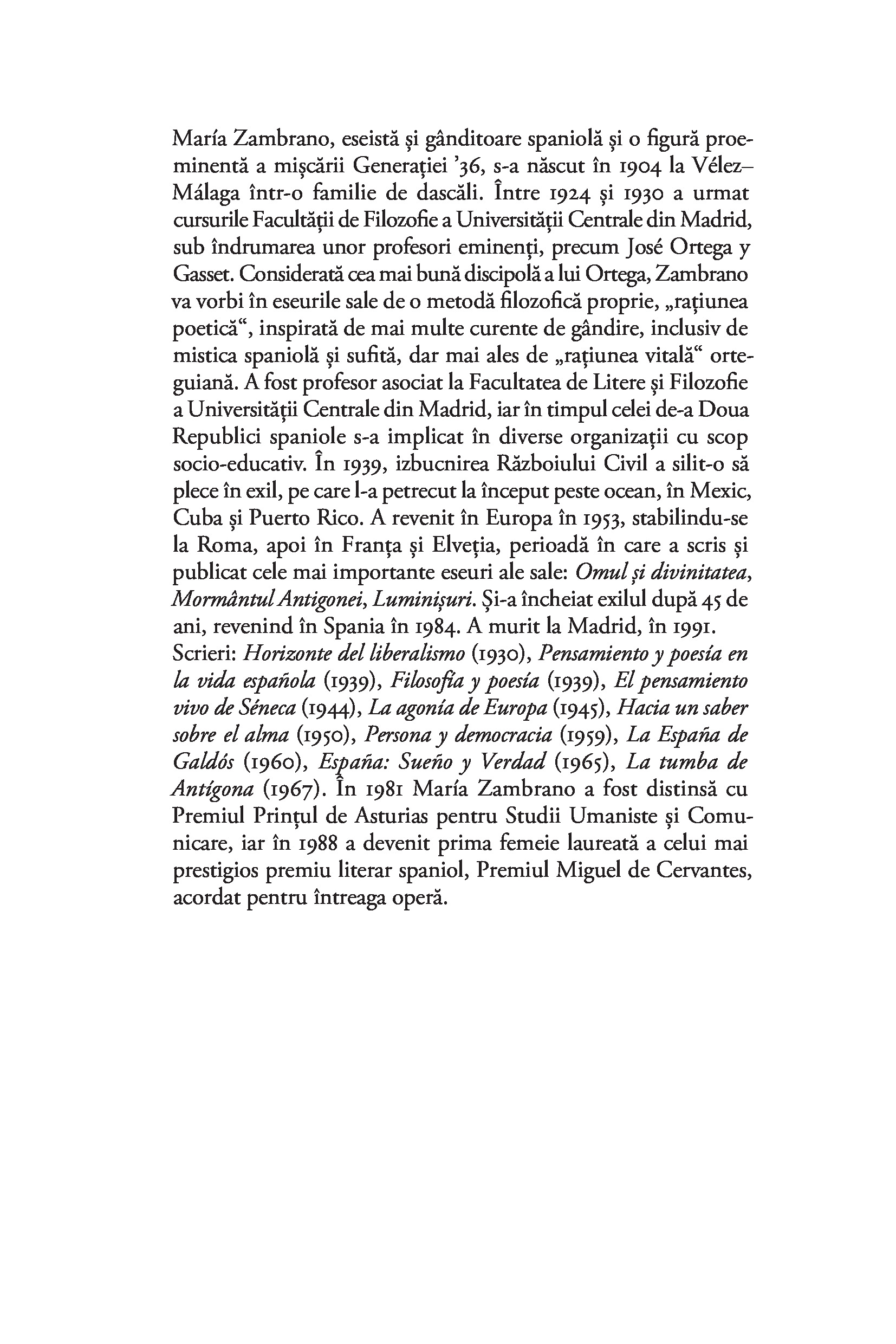 Considerată cea mai importantă femeie filozof din Spania secolului XX și cea mai bună discipolă a lui José Ortega y Gasset, María Zambrano trezește admirația tinerilor de azi prin angajarea ei în problemele com­plexe ale societății moderne și prin pasiunea cu care gândirea ei filozofică se ancorează în «toate zonele vieţii», de la etică la spiritualitate, ecologism şi critică culturală.“ — MELANIA STANCU