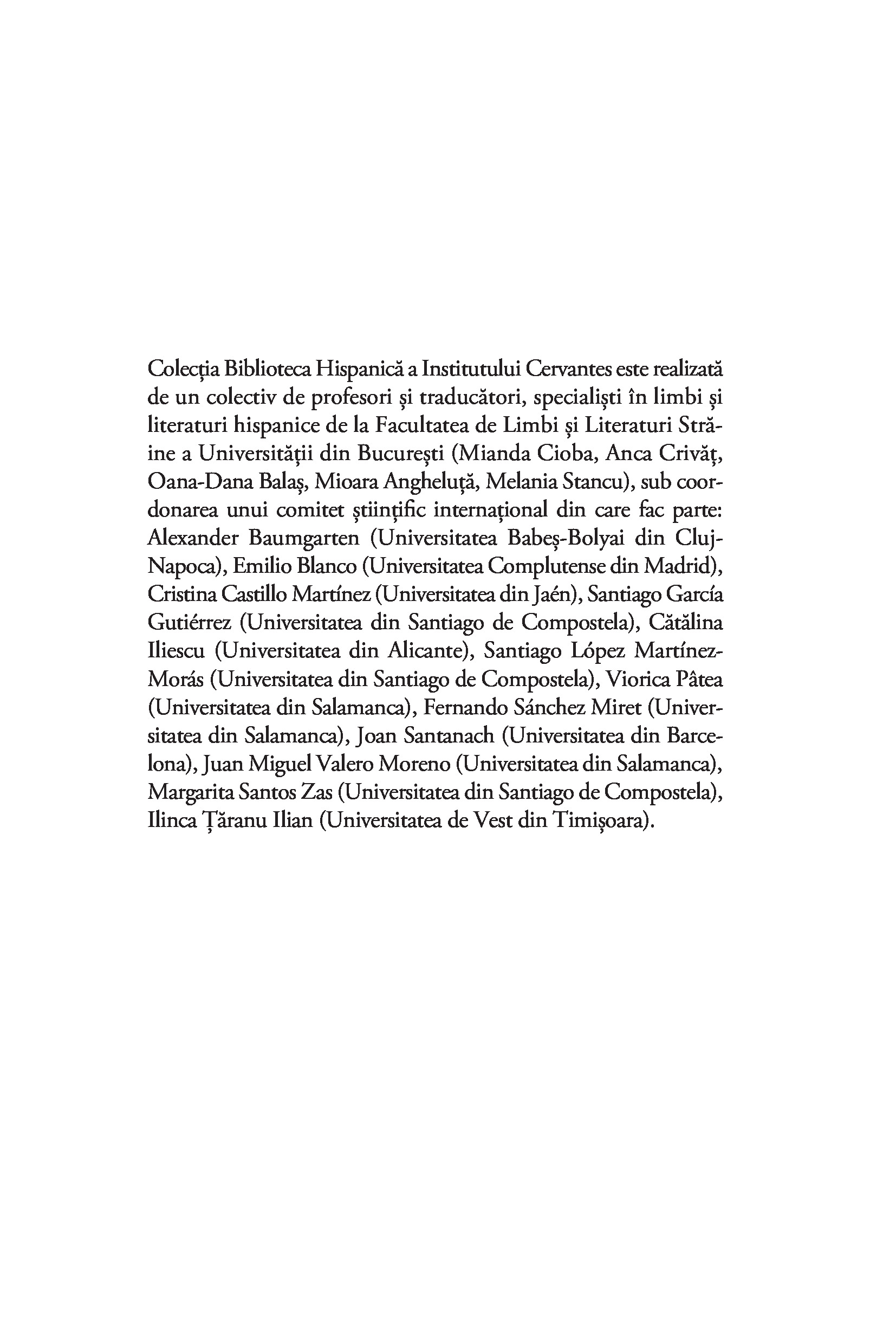 Pe fundalul unor experiențe tot mai complexe de viață comună în care lumea spaniolă și cea românească se întâlnesc într-un proces de integrare europeană din ce în ce mai intens, colecția Biblioteca Hispanică a Institutului Cervantes, în care apar traduceri din literatura spaniolă clasică și contemporană – cu o atenție specială acordată non-ficțiunii, eseisticii filozofice, reflecției etice și etico-politice –, este rezultatul colaborării dintre Institutul Cervantes din București, care a avut inițiativa acestui proiect, și Editura Humanitas. Colecția este realizată de un colectiv de profesori și traducători, specialiști în limbi și literaturi hispanice de la Facultatea de Limbi și Literaturi Străine a Universității din București, sub coordonarea unui comitet științific internațional. Titlurile colecției apar, unele dintre ele, în formulă bilingvă, și toate în condiții editoriale speciale, însoțite de un aparat critico-analitic complex.