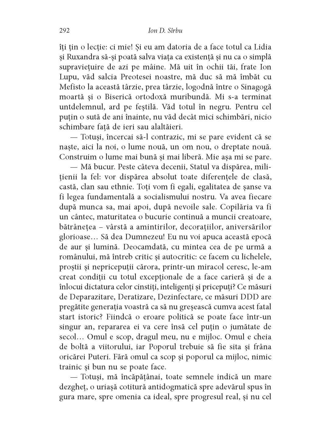 Deși fascinat de povestire… Ion D. Sîrbu este un prozator de idei și un moralist obsedat de ideea națională. Prea puțin preocupat de rotundul construcției epice, el descentrează cu bună (și veselă) știință masa narativă, în favoarea digresiunilor largi, a ospățului reflexiv. Eu proteic, el se difuzează voluptuos în contrarii psihologice, în socialistul bovaric sau evreul Talmudist, în meșterul zidar cu suflet de Noe blagian și persuasiune aproape iezuită ori în contele maghiar măcinat de soarta Imperiului.” (Dan C. Mihăilescu)