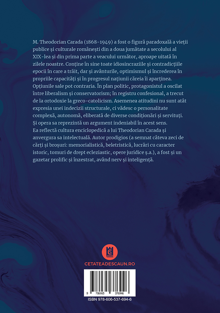M. Theodorian Carada (1868-1949) a fost o figură paradoxală a vieții publice și culturale românești din a doua jumătate a secolului al XIX-lea și din prima parte a veacului următor, aproape uitată în zilele noastre. Conține în sine toate idiosincraziile și contradicțiile epocii în care a trăit, dar și avânturile, optimismul și încrederea în propriile capacități și în progresul națiunii căreia îi aparținea. Opțiunile sale pot contraria. În plan politic, protagonistul a oscilat între liberalism și conservatorism; în registru confesional, a trecut de la ortodoxie la greco-catolicism. Asemenea atitudini nu sunt atât expresia unei indecizii structurale, ci vădesc o personalitate complexă, autonomă, eliberată de diverse condiționări și servituți. Și opera sa reprezintă un argument indeniabil în acest sens.Ea reflectă cultura enciclopedică a lui Theodorian Carada și anvergura sa intelectuală. Autor prodigios (a semnat câteva zeci de cărți și broșuri: memorialistică, beletristică, lucrări cu caracter istoric, tomuri de drept ecleziastic, opere juridice ș.a.), a fost și un gazetar prolific și înzestrat, având nerv și inteligență.
