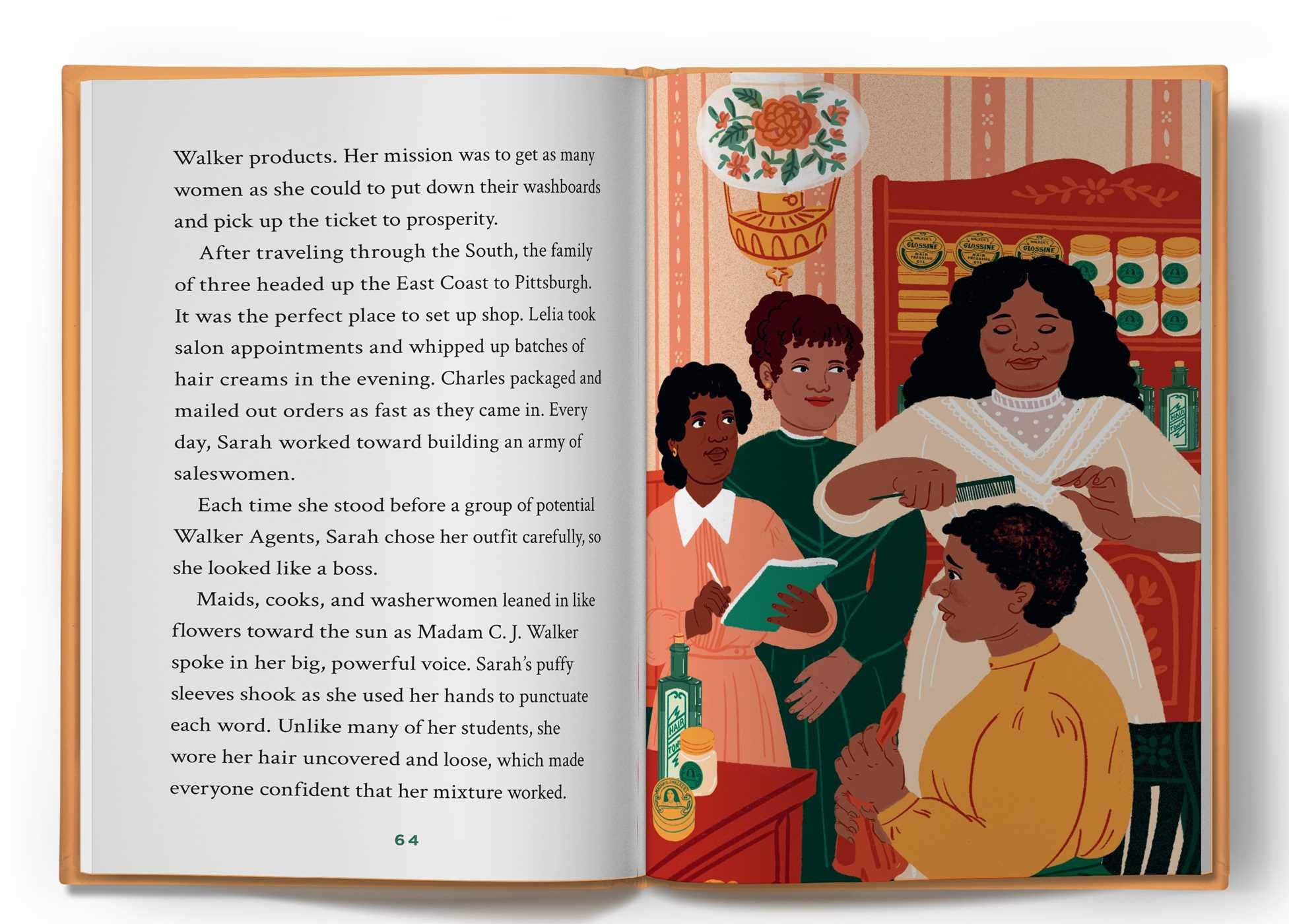 One day, Sarah's hair starts to fall out! It's itchy, crunchy, patchy, and won't grow. Instead of giving up, Sarah searches for the right products. And then she invents something better than any shampoo or hair oil she's used before. Her hair grows and grows! That's when she decides to rebrand herself as "Madam C. J. Walker," and begins her business empire.