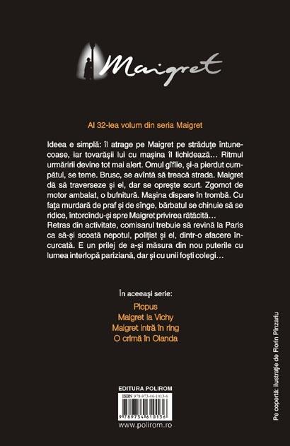 Ideea e simpla: omul il atrage pe Maigret pe stradute intunecoase, iar tovarasii lui cu masina il lichideaza... Ritmul urmaririi devine tot mai alert. Omul gifiie, si-a pierdut cumpatul, se teme. Brusc, se avinta sa treaca strada. Maigret da sa traverseze si el, dar se opreste scurt. Zgomot de motor ambalat, o bufnitura. Masina dispare in tromba. Cu fata murdara de praf si de singe, barbatul se chinuie sa se ridice, intorcindu-si spre Maigret privirea ratacita...