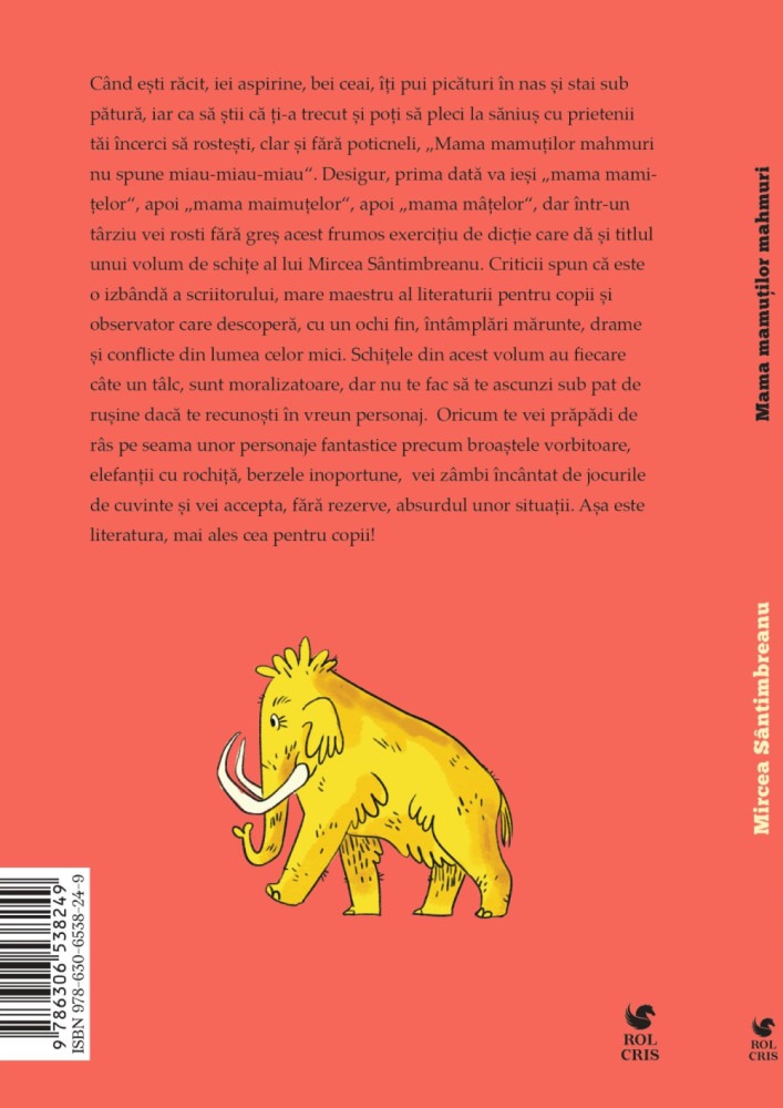 Când ești răcit, iei aspirine, bei ceai, îți pui picături în nas și stai sub pătură, iar ca să știi că ți-a trecut și poți să pleci la săniuș cu prietenii tăi încerci să rostești, clar și fără poticneli, „Mama mamuților mahmuri nu spune miau-miau-miau“. Desigur, prima dată va ieși „mama mamițelor“, apoi „mama maimuțelor“, apoi „mama mâțelor“, dar într-un târziu vei rosti fără greș acest frumos exercițiu de dicție care dă și titlul unui volum de schițe al lui Mircea Sântimbreanu.