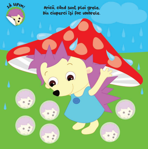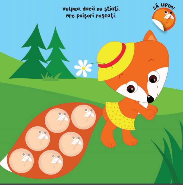 Ilustrații drăgălașe cu puiuți de animale, texte nostime cu rimă și 80 de abțibliduri cu margini rotunjite ca să se lipească ușor.