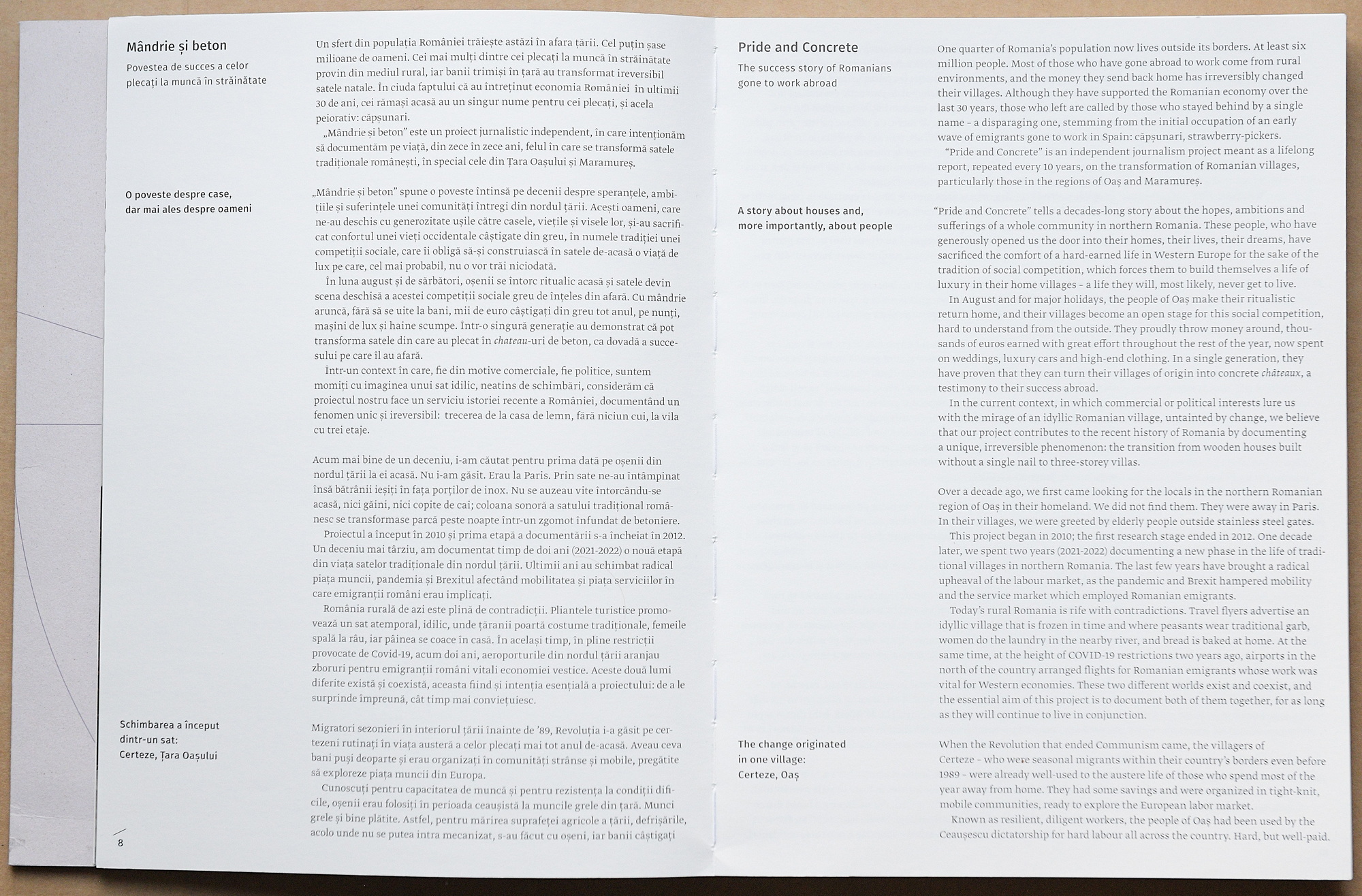 Mândrie și Beton (2010-2023) este cea mai lungă documentare vizuală a unui fenomen social din România de până acum - transformarea satelor tradiționale după plecare oamenilor la muncă în străinătate.
