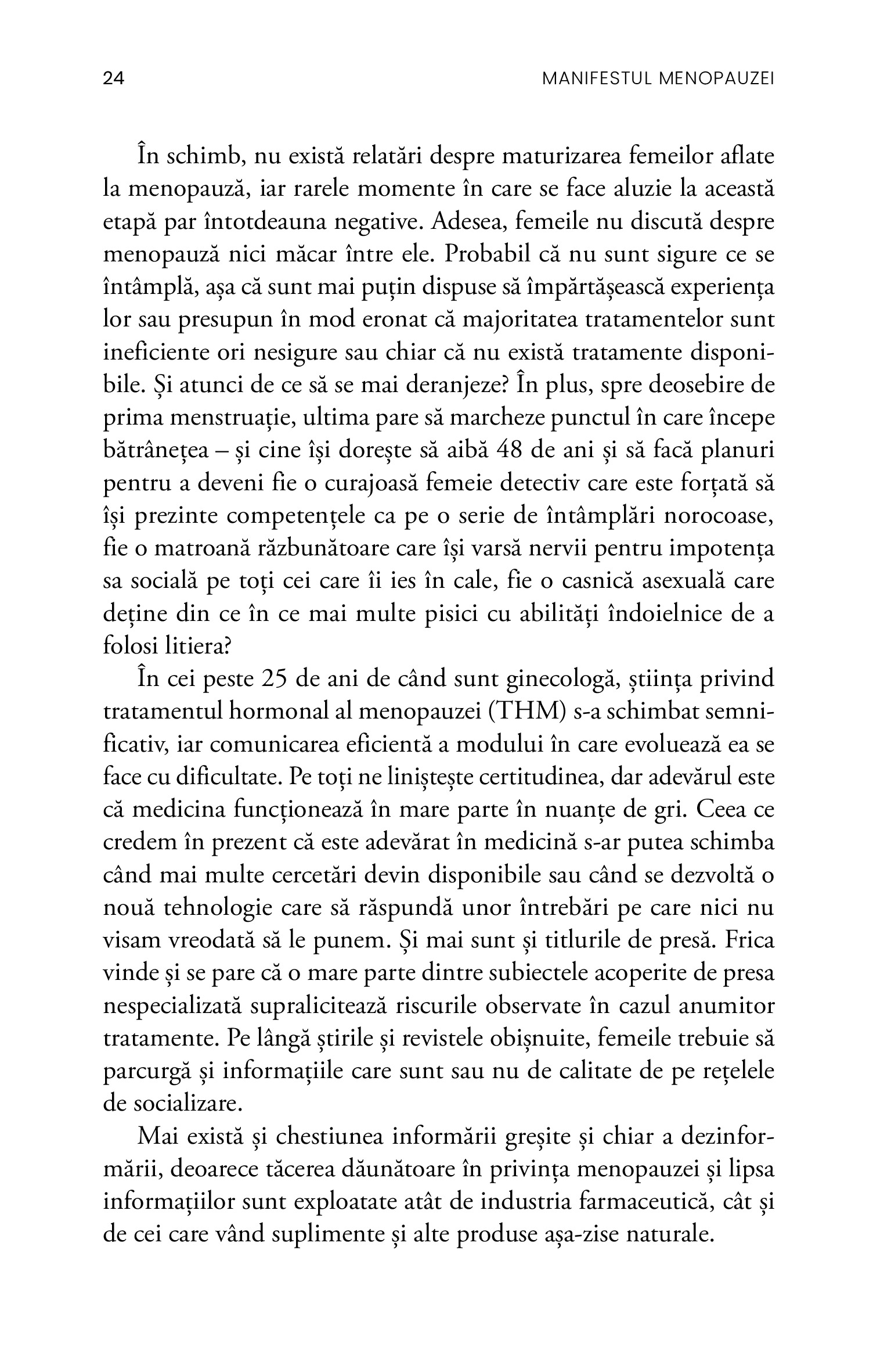 Ea lasă deoparte cultura rușinii în privința corpului feminin și explică, pe rând, cum să te confrunți cu bufeurile, care sunt beneficiile și riscurile tratamentului hormonal, cum să contracarezi osteoporoza, să dormi mai bine și să ai o viață sexuală împlinită. Pe scurt, cum să te bucuri de sănătate și de energie la orice vârstă.