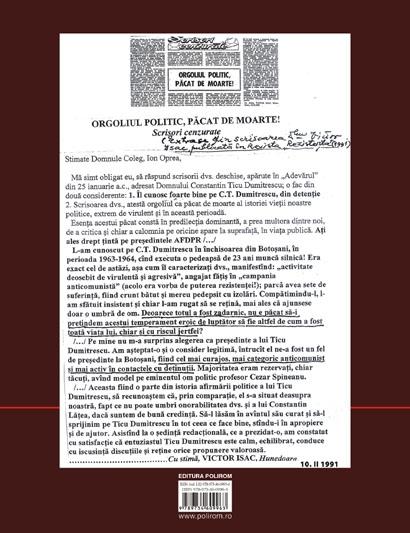 "Daca pina la urma m-am hotarit totusi sa public aceste memorii, am facut-o inainte de toate ca o datorie de constiinta. Am trecut si eu prin iadul inchisorilor comuniste si aceasta experienta de viata si istorie traita si asumata poate servi celor care vin dupa noi, sa cunoasca si mai ales sa impiedice repetarea unui asemenea trecut. N-am fost eroul unei clipe de entuziasm, ci omul care, de-a lungul a mii de zile de temnita si anchete, a ramas dirz si demn in fata tuturor incercarilor si metodelor de anchetare, umilinta sau compromitere. N-am avut tinerete, insa am dobindit cel mai paradoxal titlu de noblete din istoria umanitatii, cel de detinut politic. Pentru a-l fi avut, incercarile erau insa atit de grele, incit costau adesea viata; cei care l-au primit nu l-au dorit si nu l-au cerut, iar cei care l-au acordat nu si-au dat seama ca ne innobileaza, ci au crezut exact contrariul." (Constantin Ticu Dumitrescu)