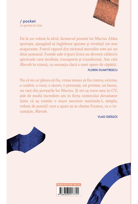 De la un volum la altul, farmecul poeziei lui Marius Aldea sporește, ajungând să înglobeze spaime și revelații tot mai acaparante. Fostul rapsod din tărâmul moroilor este azi un ditai șamanul. Fostele sale tripuri lirice au devenit călătorii spirituale care învăluie, transportă și transformă. Am citit Maruth în transă, cu senzația clară a unei opere de căpătâi.