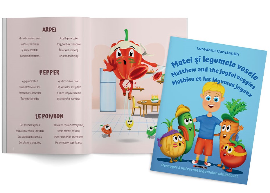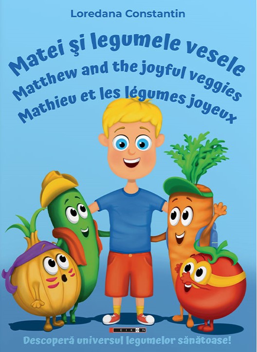 Matei îţi explică mai multe despre legume şi rolul lor în corpul nostru prin intermediul unui text trilingv în limbile română, engleză şi franceză. Acest volum de poezioare destinate celor mici poate deveni un adevărat sprijin pentru părinţi în educarea zilnică a celor mici privind legumele şi alimentaţia.