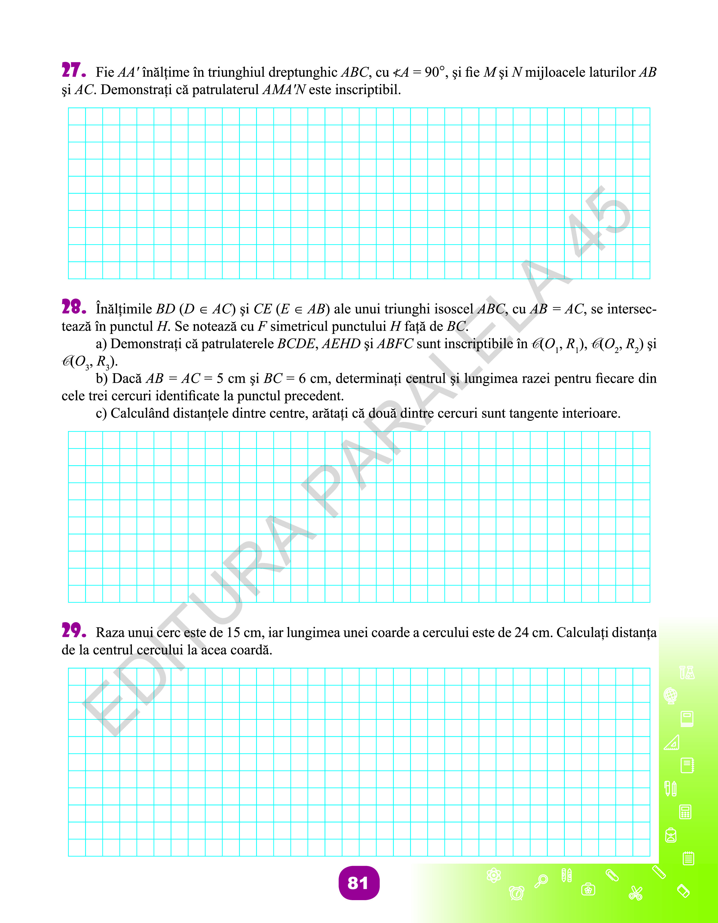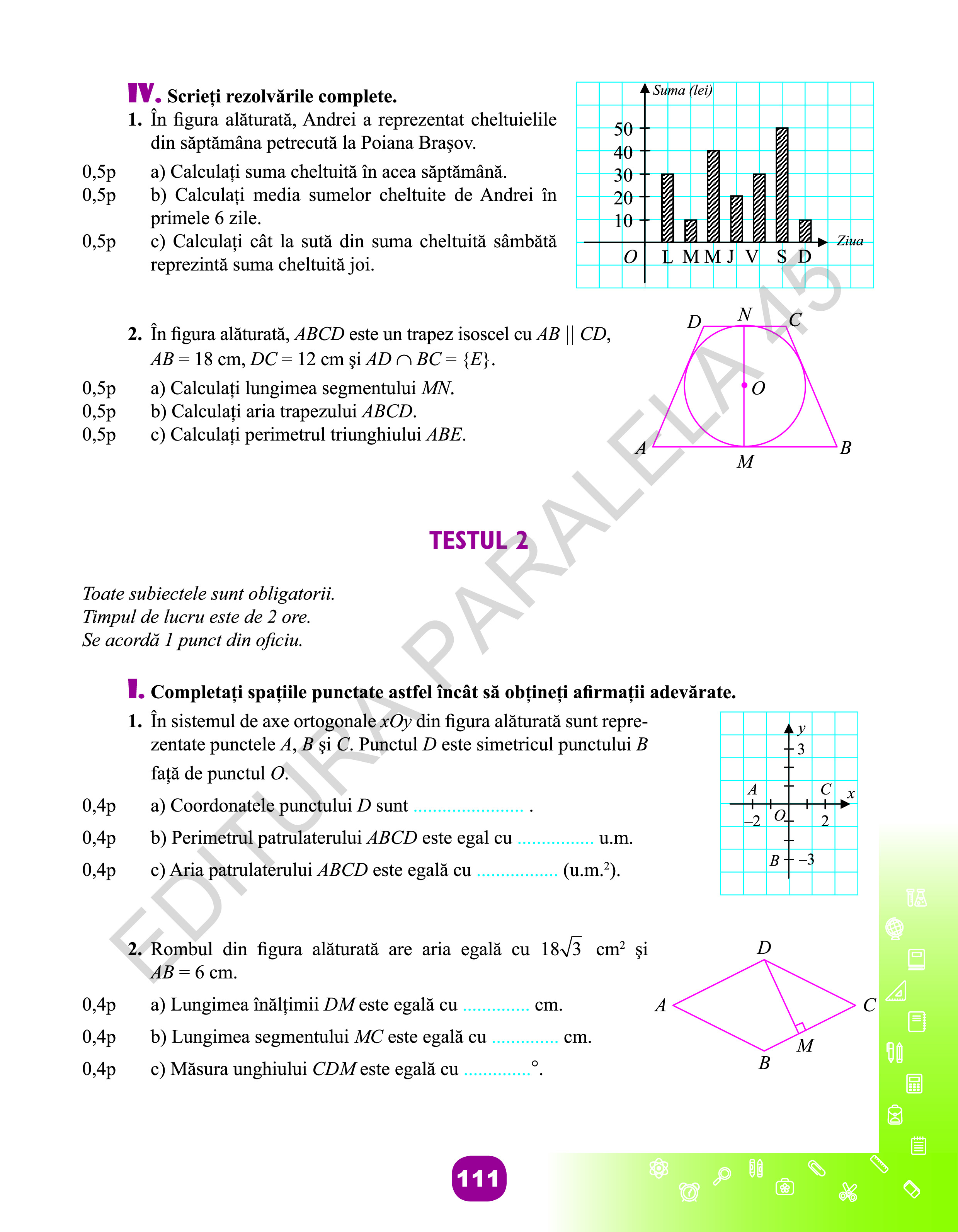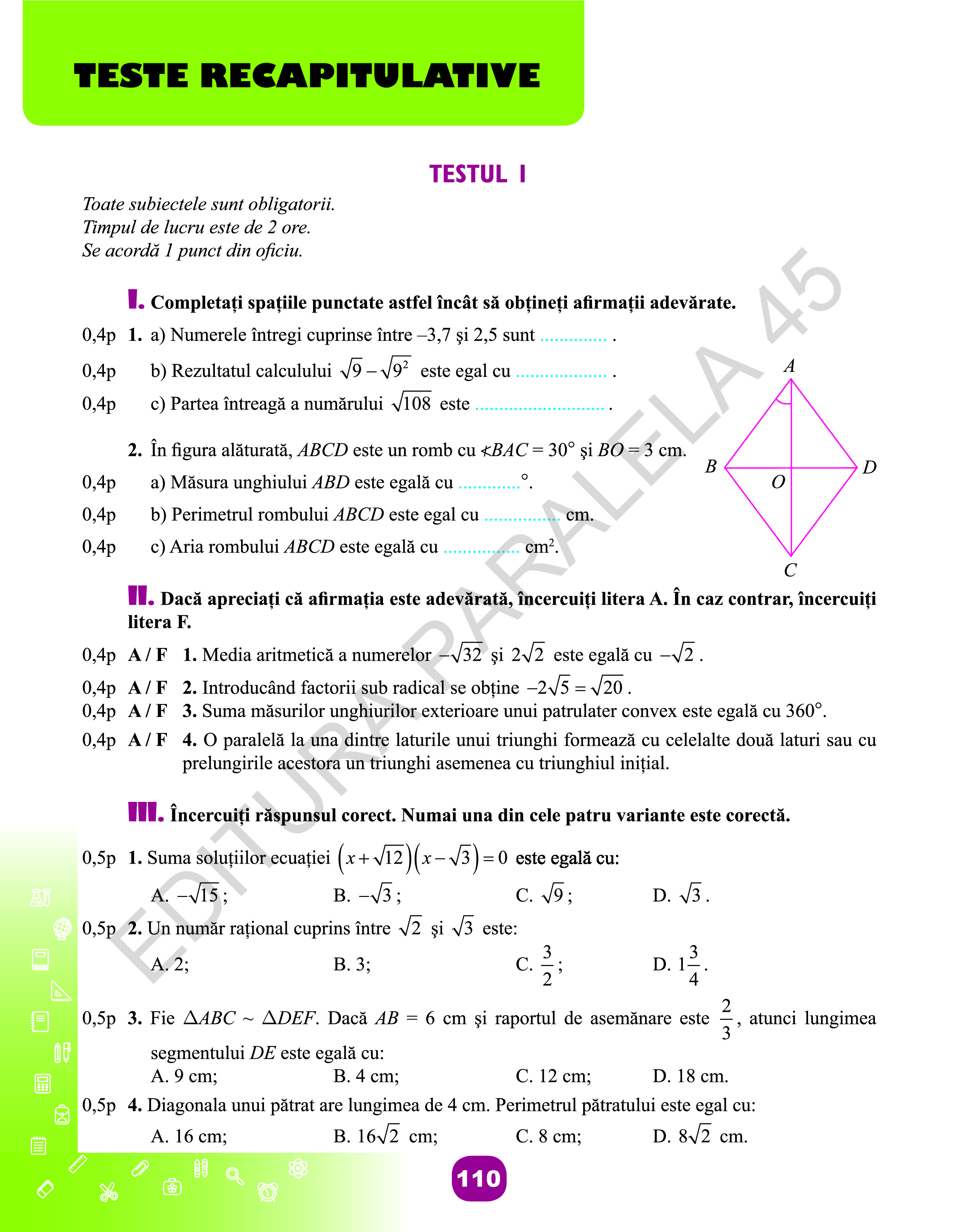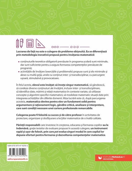 Culegerea poate fi folosită cu succes și de către profesor în activitatea de proiectare, organizare și desfășurare a lecțiilor matematice de o înaltă calitate.