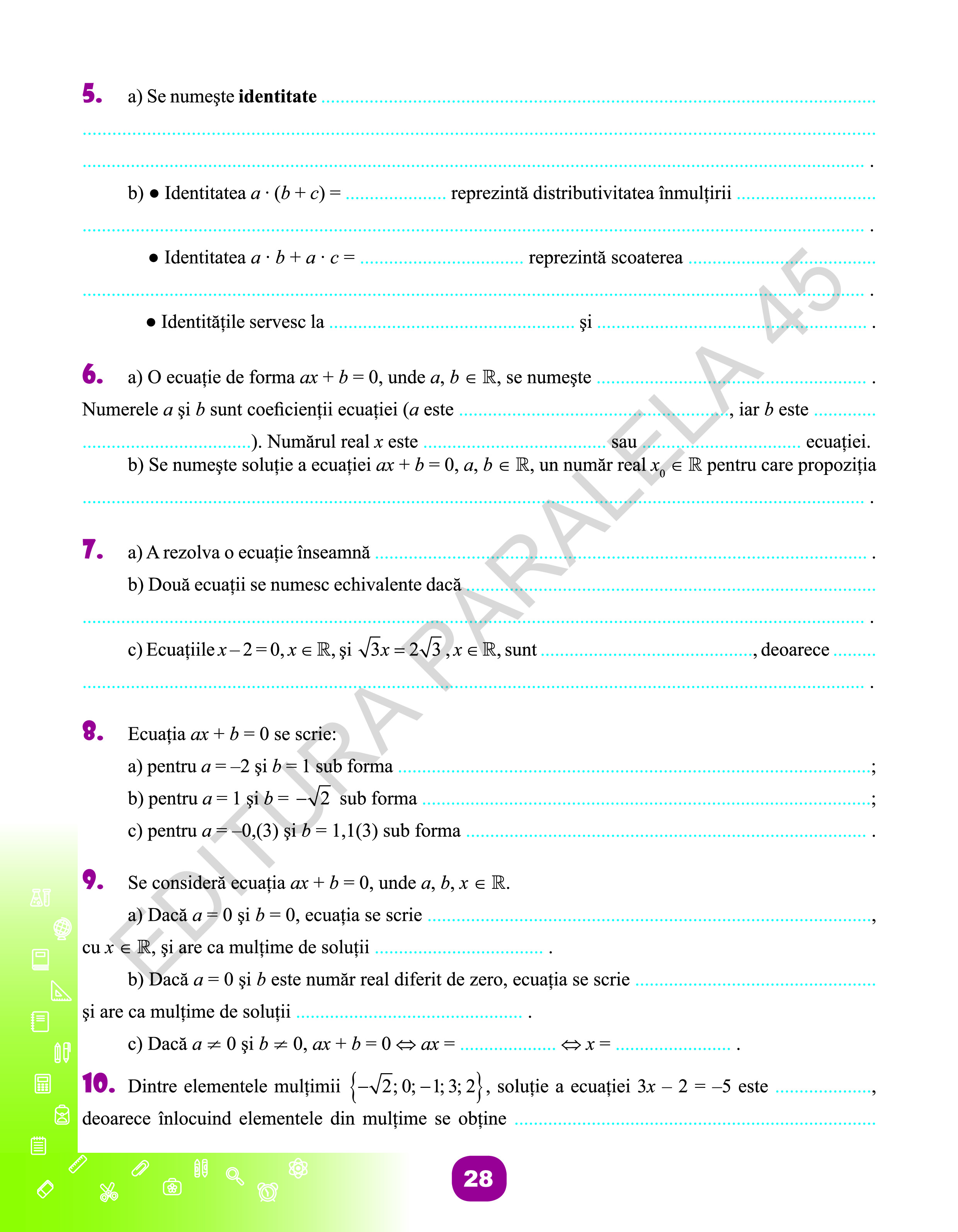 • activitățile de învățare (exercițiile și problemele) propuse sunt și ele minimale și alese cu multă grijă, unele cu conținut inter- și transdisciplinar, cu parcurgere ușoară, stimulativă și provocatoare.