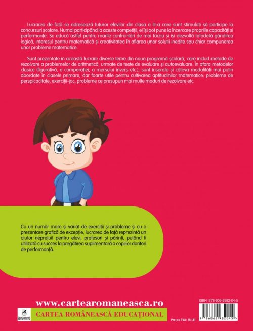 Lucrarea de faţă se adresează tuturor elevilor din clasa a III-a care sunt stimulaţi să participe la concursuri şcolare. Numai participând la aceste competiţii, ei îşi pot pune la încercare propriile capacităţi şi performanţe. Se educă astfel pentru marile confruntări de mai târziu şi îşi dezvoltă totodată gândirea logică, interesul pentru matematică şi creativitatea în aflarea unor soluţii inedite sau chiar compunerea unor probleme matematice.