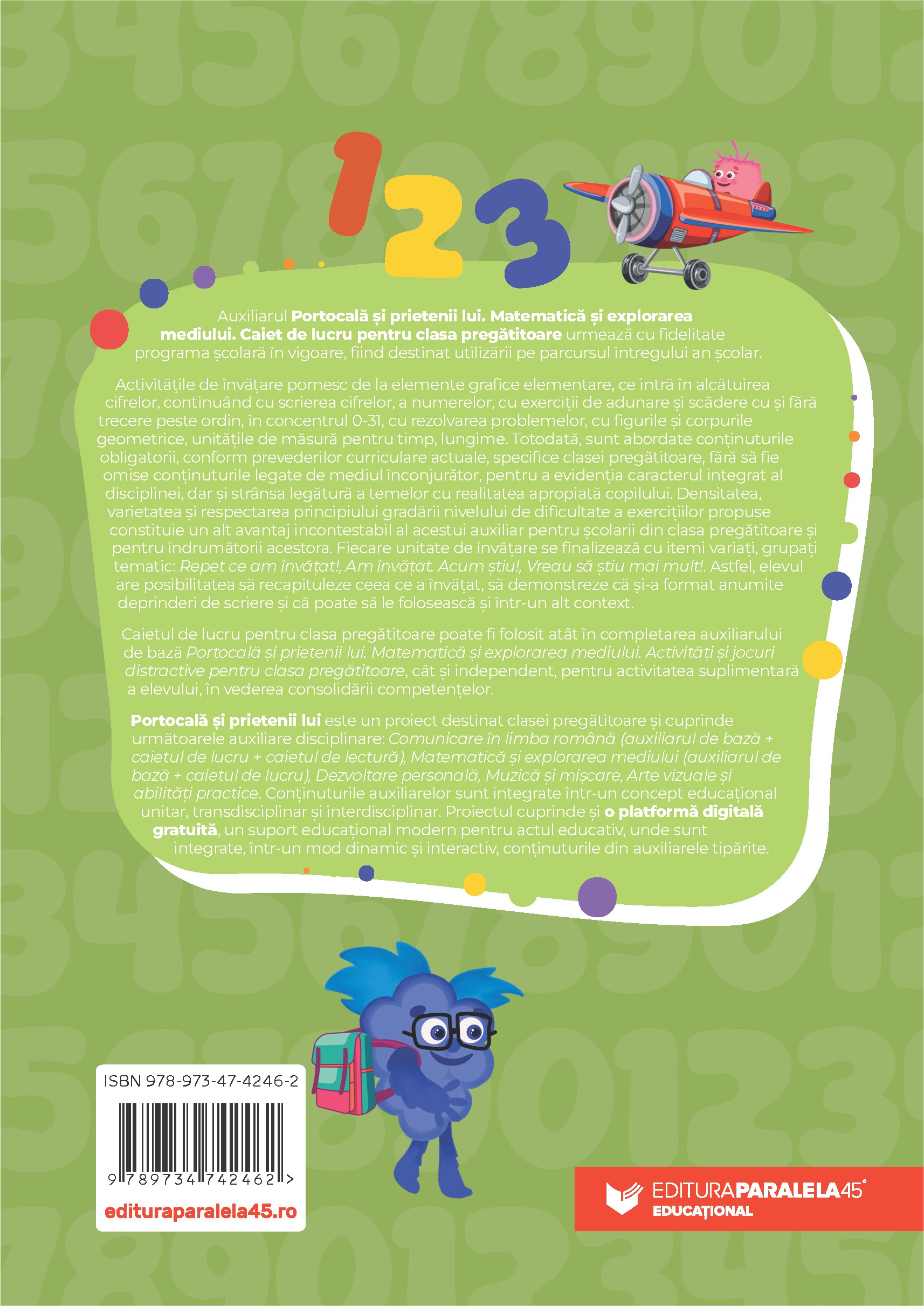 Auxiliarul Portocală și prietenii lui. Matematică și explorarea mediului. Caiet de lucru pentru clasa pregătitoare urmează cu fidelitate programa școlară în vigoare, fiind destinat utilizării pe parcursul întregului an școlar.