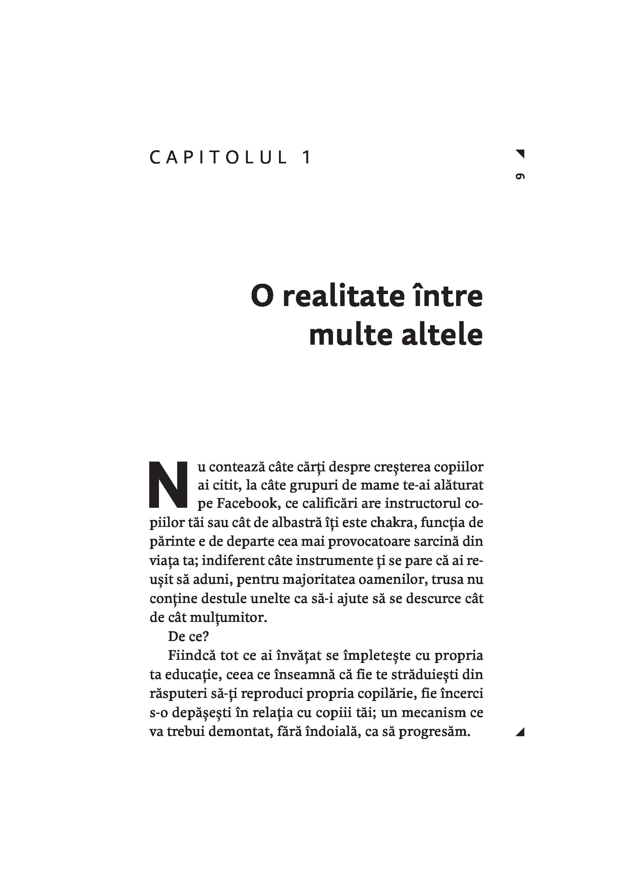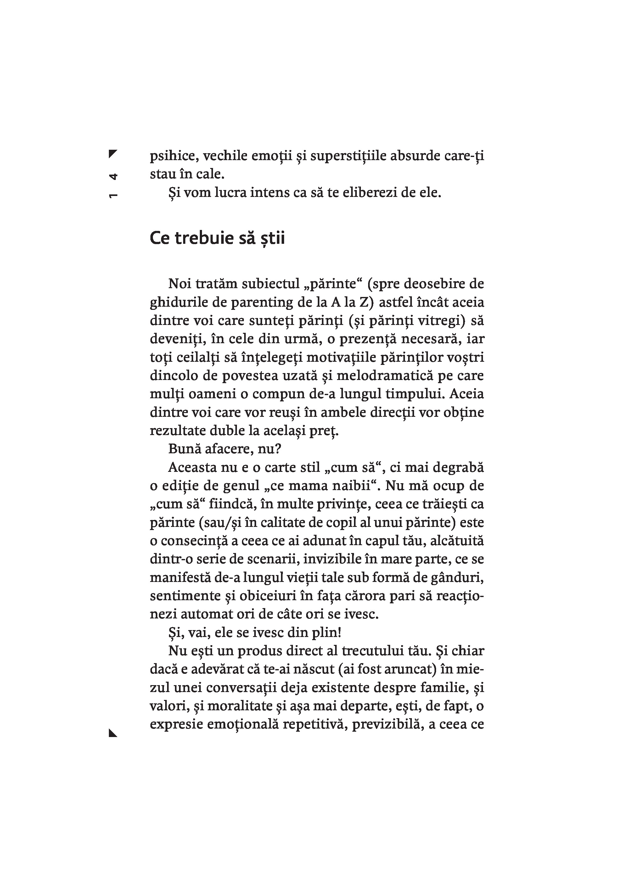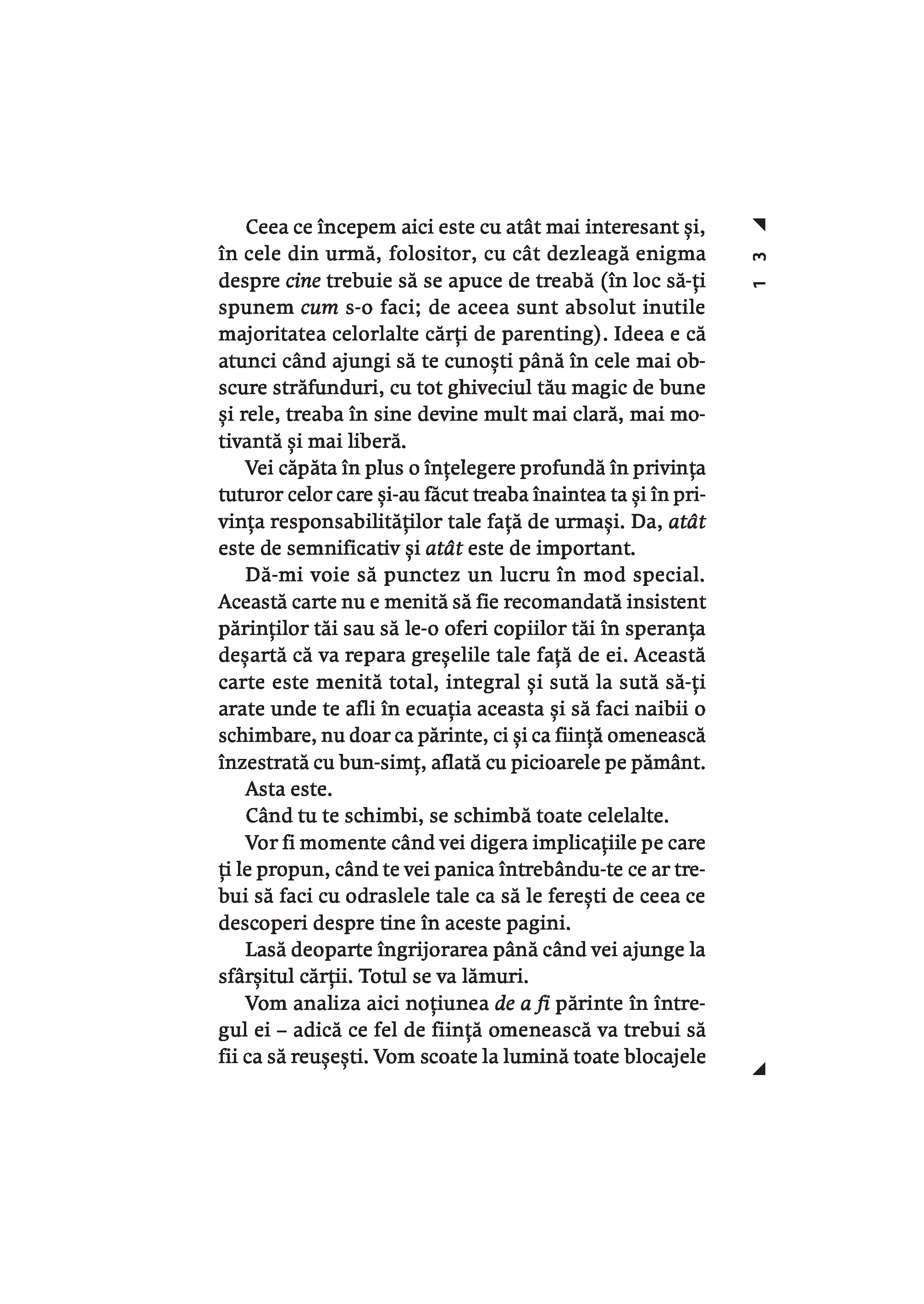 Fie că ești părinte, vrei să devii părinte sau pur și simplu ai părinți, cartea de față scoate la lumină adevăruri esențiale despre cine ești și cum te prezinți lumii – de ele depinde capacitatea de a prelua total controlul asupra direcției vieții tale și a le arăta copiilor cum să-și urmeze propriul drum.