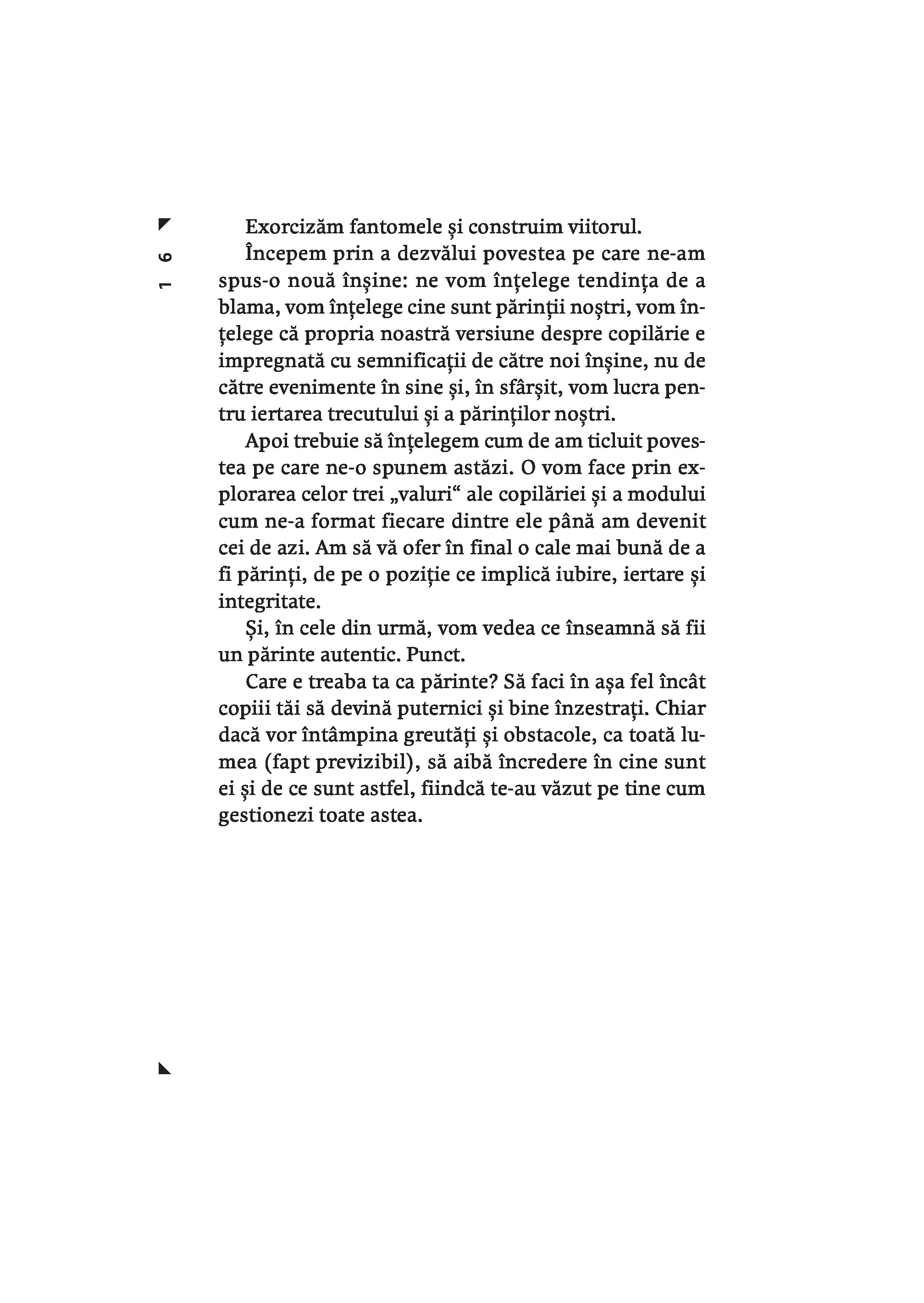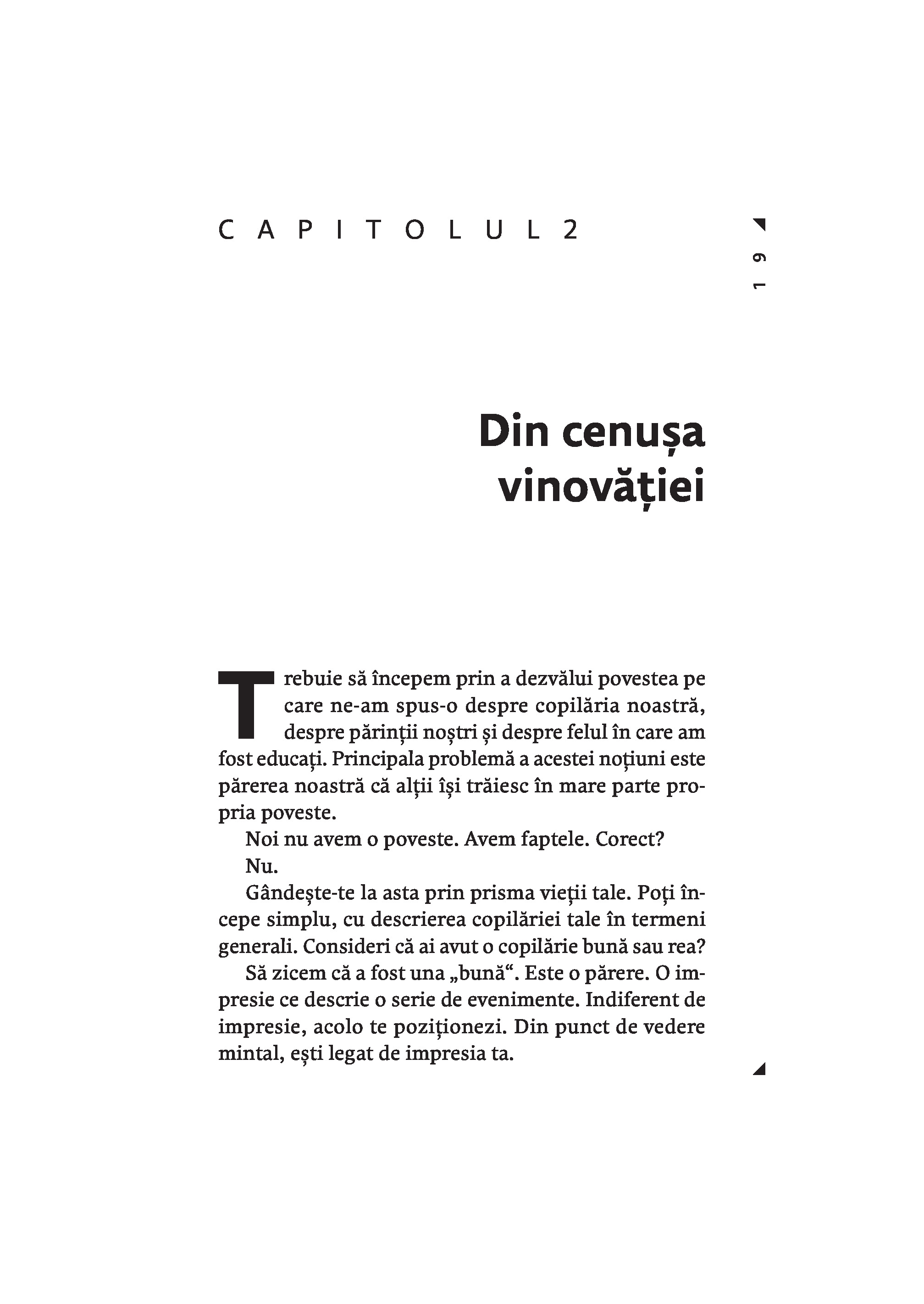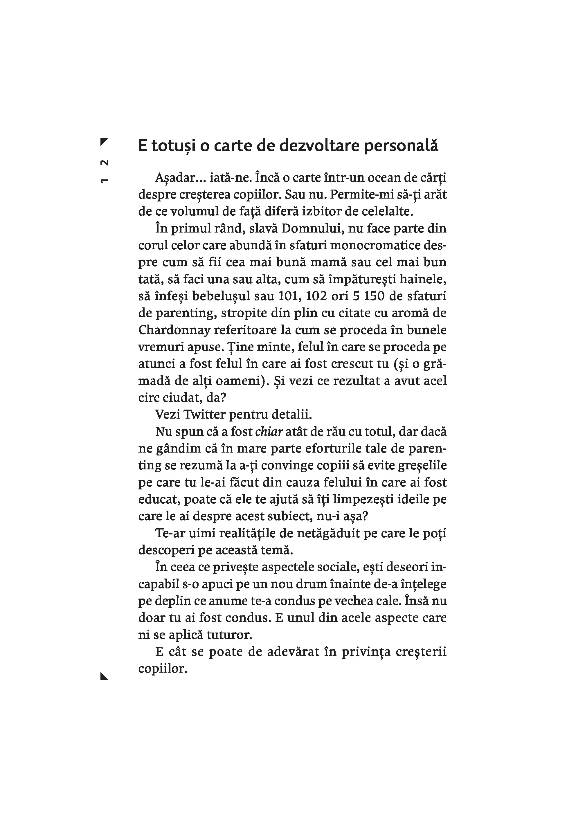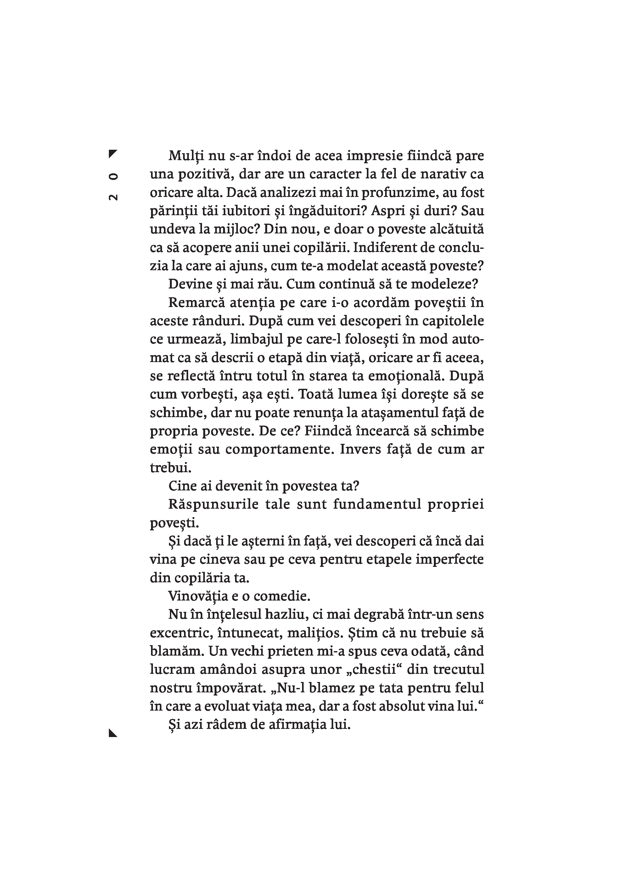 Fie că ești părinte, vrei să devii părinte sau pur și simplu ai părinți, cartea de față scoate la lumină adevăruri esențiale despre cine ești și cum te prezinți lumii – de ele depinde capacitatea de a prelua total controlul asupra direcției vieții tale și a le arăta copiilor cum să-și urmeze propriul drum.