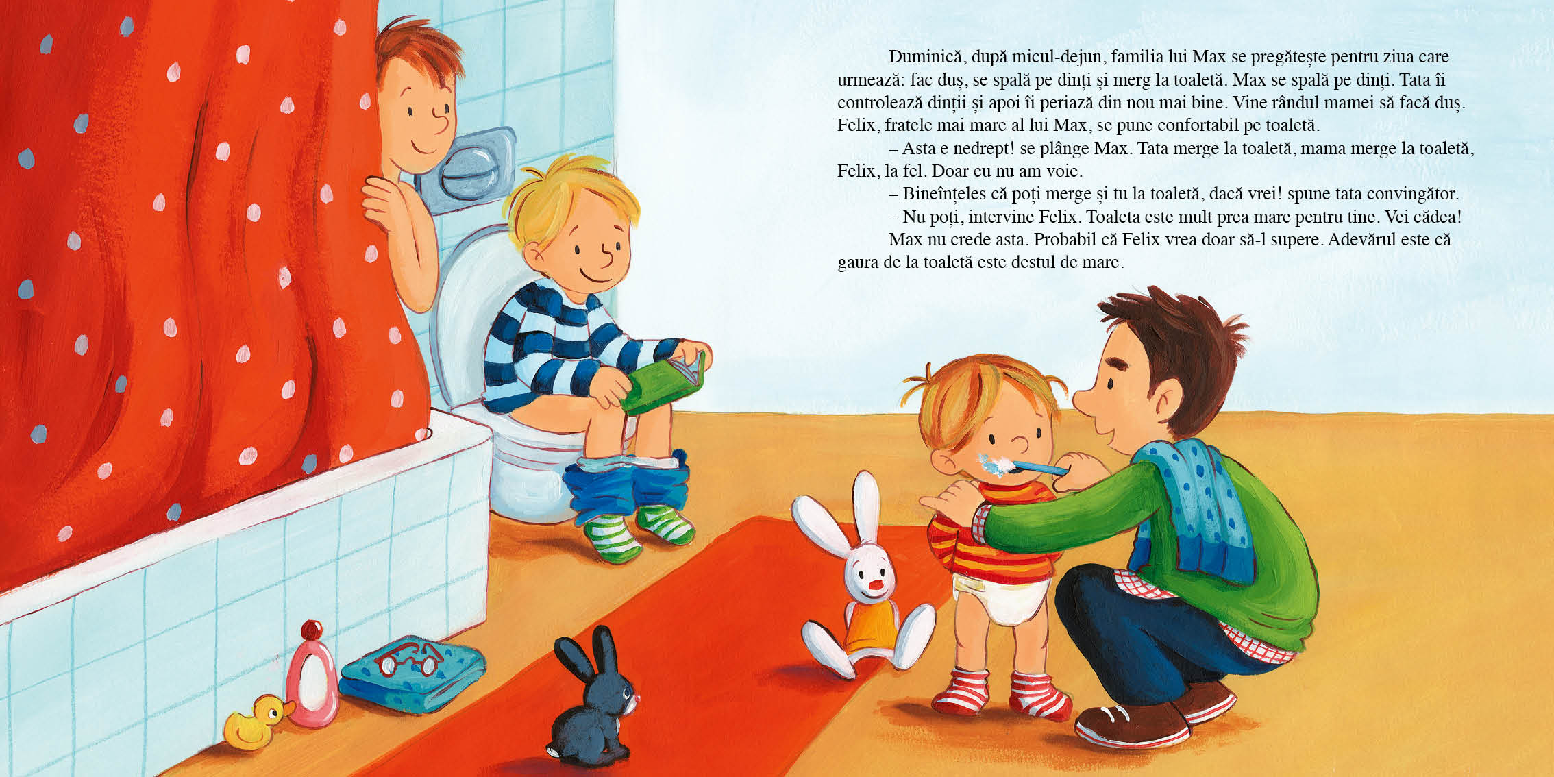 Max este decis să învețe cum să procedeze „ca cei mari”, iar prin această experiență, copiii pot înțelege că procesul e natural, pas cu pas, și că mici accidente pot apărea – și e în regulă.
