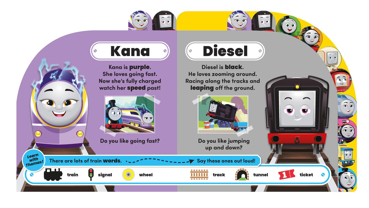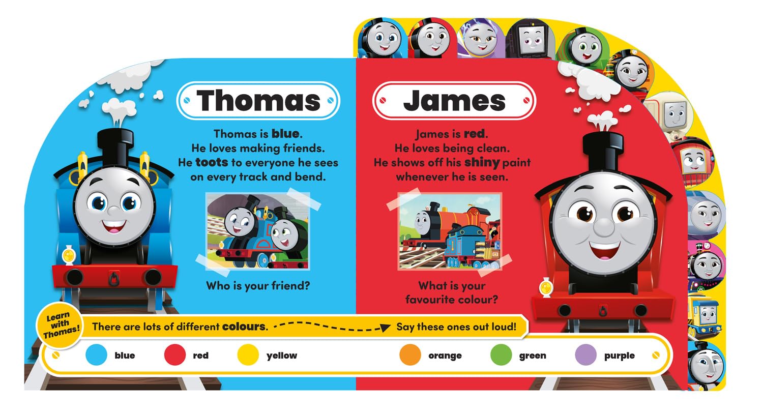 In this bright and appealing large tabbed board book meet Thomas and his many vehicle friends on the Island of Sodor. With everyone’s favourite engines Thomas, Percy, Diesel, Nia and Kana as well as Harold the Helicopter, Carly the Crane, Bruno the Brake Car as well as Kenji, Ashima, James and Gordon, young fans will love finding hearing the rhyming text about the characters and saying the early learning concepts out loud too!