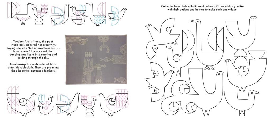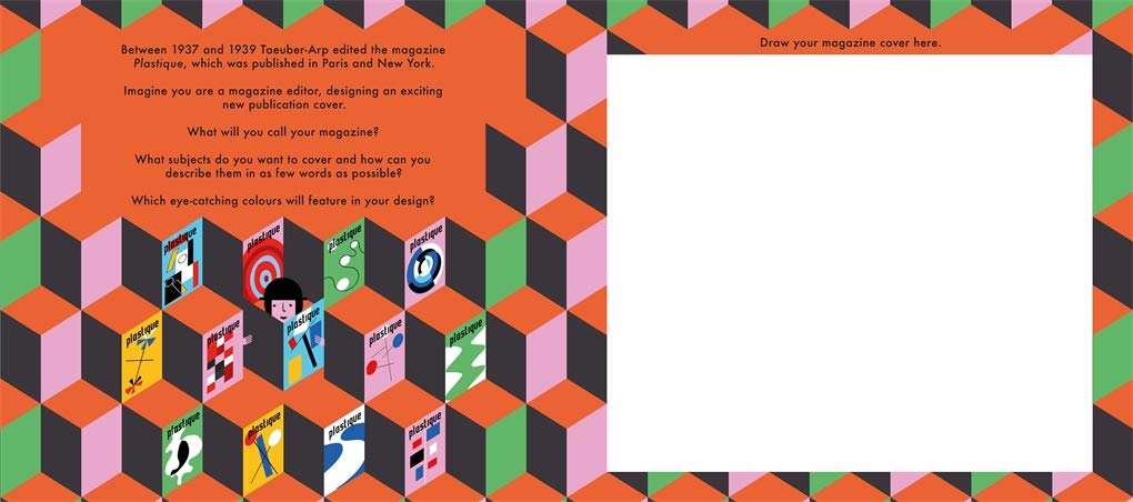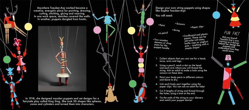 This activity book includes a brief introduction to the artist’s life, including her role as one of the founders of the Dada art movement, followed by a series of activities, such as weaving and puppet making, that explore prominent themes and ideas in Taeuber-Arp’s body of work.