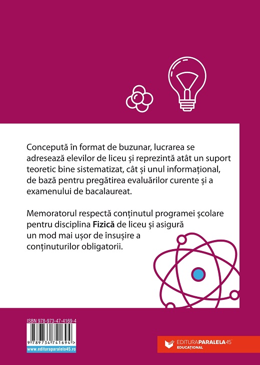 Memoratorul respectă conținutul programei școlare pentru disciplina Fizică de liceu și asigură un mod mai ușor de însușire a conținuturilor obligatorii.