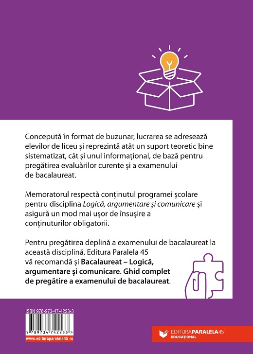 Pentru pregătirea deplină a examenului de bacalaureat la această disciplină, Editura Paralela 45 vă recomandă și Bacalaureat – Logică, argumentare și comunicare. Ghid complet de pregătire a examenului de bacalaureat.