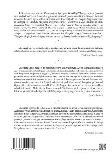 Când l-a descoperit pe Theophil Magus, Leonard Oprea a fost repede devorat de personajul său. El a dispărut ca autor și s-a născut magul, creștin în declarații, nietzsche-an în formulări. Adică tăios, concis, liric și vehement în proclamarea credinței. Nu este un simplu alter ego, ci ceva mai mult. Și mai complicat. Leonard Oprea este deja la a șaptea carte în care face să răsune vocea straniului mistic și mag. Carte ex-centrică, precum precedentele, poematică și gnomică. Narcisiacă și încântată de splendoarea Creației. Comentariul se intimidează, astfel de texte sunt, în genere, rotunde și lipsite de asperitățile vieții, nu ai puncte de contact, „golurile” în care se introduce comentariul, mai mult sau mai puțin scorțos. Text sapiențial, cultivă din abundență paradoxul, rostirea oraculară, vocația premonitorie. Sunt reflecții care se scurg într-un torent, analiza lor nu îmbogățește neapărat cititorul, ci priveliștea de ansamblu. Urmărești un traseu al gândirii și cam asta este totul. Dumnezeu tace, spune la un moment dat autorul, și lucrul este o temă teologică esențială. În interioul acestei tăceri a creației răsună cuvintele noastre. Vorbesc oamenii în numele Său, ori magi, ca aici. Dumnezeu vorbește unor oameni, care vorbesc despre El celorlalți și care vorbesc întru Dumnezeu, prin slavă. Este o vorbire despre ceea ce nu se poate vorbi. De aici și poemul care prin structură este tăcere: haiku-ul, ca parte componentă, încheiere întru liniște, a fiecărui fragment din această carte. De fapt, nu este totdeauna ușor să discernem cu care dintre logosurile enumerate mai sus avem de-a face în text. Căci se poate vorbi despre Dumnezeu, cu Dumnezeu sau în Dumnezeu. Am impresia că visul lui Theophil (dar al cărui esoteric nu este?) este atingerea ultimului dintre aceste stadii ale dialogului: cel imnic, laudativ. Autorul alternează, visează, vizează, intenționează schimbarea vocilor. Ascultă și proclamă. Gesturi greu de conciliat simultan. Are știința de a se lăsa dus de text unde vrea textul. Maximă libertate! Reverențioasă. Scriitorul este pe alocuri mai mult un moralist decât un teolog. Și nu e rău… Iar fragmentarismul mărește tensiunea ideii. Este un text de mărturisire frenetică, abilitatea autorului constă în a se lăsa purtat de cuvinte, în voia șuvoiului, cu credința că el îl va duce direct la țintă. Structura unui fragment este bine sugerată de un exemplu precum: „DILEMĂ sau POSTULAT? Despre om și faptele sale – așa apare – de mii de ani nu avem decît astfel: Rău; mai puțin rău; cel mai rău… și de ne-imaginat rău. La un moment dat, fără ezitare, dar cred eu și tăios, Iisus ne lămurește: «Pentru ce mă numești bun? Nimeni nu este bun, decît Unul singur Dumnezeu».” După care urmează un haiku: „trei mierle – în zori…/se bălăcesc în pîrîu…/un fulg, doi – ninge…”. Comentariul citatului scripturistic este construit fie la modul poematic, fie la modul catehetic. Autorul se instituie în postura de învățător care are de transmis ceva, pornind de la cuvântul primordial. „SPLENDOAREA LUI MESSIAH…… Iisus este revelată cînd om murind pe cruce El Dumnezeu se roagă lui Dumnezeu: «Tată, iartă-i, că nu știu ce fac! »”. Tonul profetic presupune funcția de mediator. Nu este dogmatic, doar persuasiv. În aceasta constă caracterul „literar” al opului de față. Inclasabil după rigorile teoriilor ad litteram. Magul este cel care aduce daruri. Daruri simple, tocmai în asta constă valoarea lor. De aici – metafizica simplității. Și caracterul imnic, liric al fragmentelor