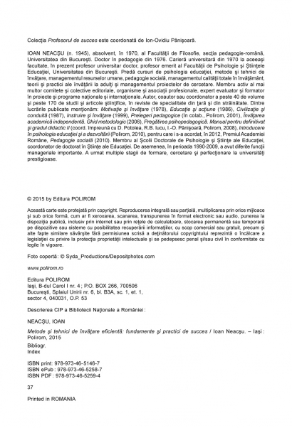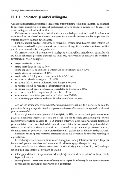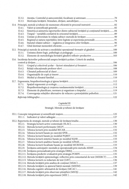 Conform cercetarilor recente, invatarea poate fi facilitata de insusirea unor seturi de tehnici adecvate. Volumul prezinta cele mai eficiente strategii care pot fi aplicate in vederea unei acumulari rapide si pe termen lung a cunostintelor stiintifice: metode de documentare si prelucrare a informatiilor, solutii de memorare, modalitati de crestere a randamentului, de planificare si organizare a timpului, de optimizare a stilului de lucru si de concentrare a atentiei. Sectiuni speciale sint dedicate diferitelor forme de comunicare, proceselor de argumentare, contraargumentare si persuasiune, precum si regulilor de elaborare a lucrarilor didactico-stiintifice sau de organizare si conducere a reuniunilor si dezbaterilor. Elementele teoretice sint ilustrate cu studii de caz, aplicatii practice si metodologice care contribuie la o mai buna intelegere a conceptelor expuse. Sinteza a mai multor perspective metodologice, Metode si tehnici de invatare eficienta este un ghid de crestere a performantei si dezvoltare a competentelor util atit studentilor, cit si profesorilor.