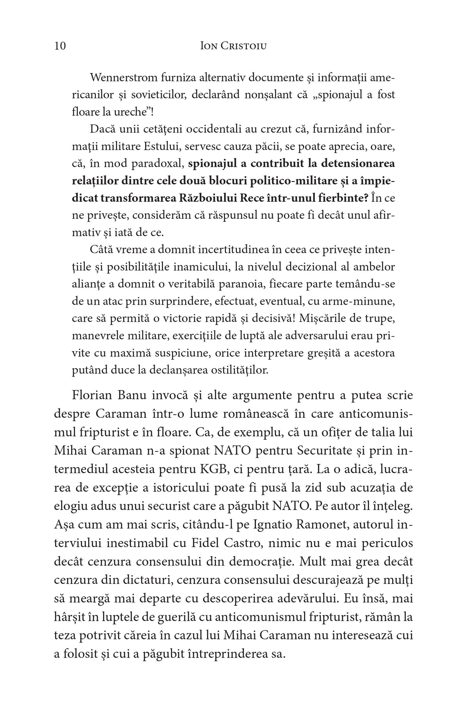 „Mihai Caraman e unul dintre cei mai mari spioni din istoria Intelligence-ului românesc. Cu toate acestea, așa cum demonstrează Florian Banu în Introducere, despre acest spion s-a scris puțin în România. [...] Lovitura dată de Florian Banu prin cartea sa constă în faptul că Mihai Caraman a acceptat să-i facă dezvăluiri despre activitatea sa ca făuritor și coordonator al Rețelei care a spart NATO. ” - Ion Cristoiu