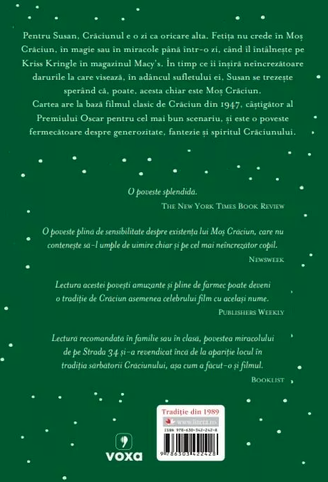 Lectură recomandată în familie sau în clasă, povestea miracolului de pe Strada 34 și-a revendicat încă de la apariție locul în tradiția sărbătorii Crăciunului, așa cum a făcut-o și filmul. -- Booklist