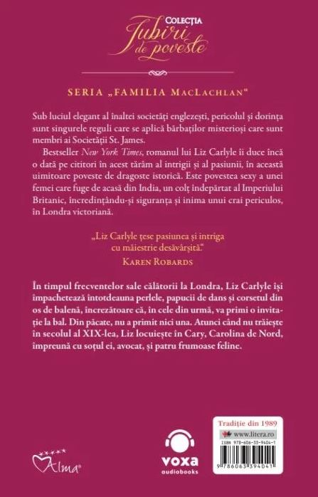 Bestseller New York Times, romanul lui Liz Carlyle îi duce încă o dată pe cititori în acest tărâm al intrigii și al pasiunii, în această uimitoare poveste de dragoste istorică. Este povestea sexy a unei femei care fuge de acasă din India, un colț îndepărtat al Imperiului Britanic, încredințându-și siguranța și inima unui crai periculos, în Londra victoriană.