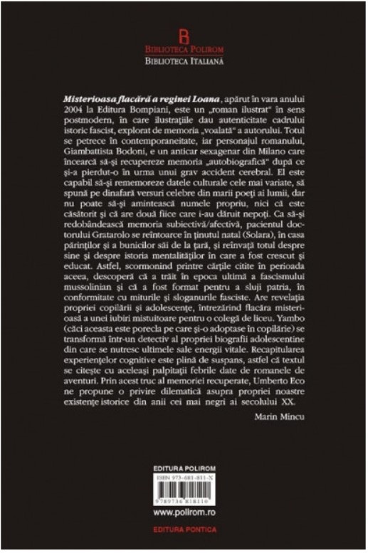 Romanul se incheie cu o lista de peste 250 de trimiteri bibliografice, minutios alcatuite, in care gasim afise Fiat, desene de Walt Disney, traduceri italiene din Barbey d’Aurevilly, fotografii cu Josephine Baker si Tyronne Power, ilustratii cu fabulosul Mandrake si, fireste, cartea din 1934 a americanului Lyman Young – Misterioasa flacara a reginei Loana – de la care Eco imprumuta insusi titlul romanului sau ilustrat.
