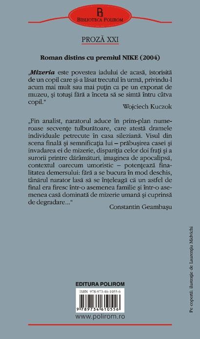 Mizeria (2003) este un roman partial autobiografic, prin care tinarul autor polonez se alatura noului val de prozatori central-europeni care-si exorcizeaza, in povestiri si romane, copilaria cosmaresca, dar aureolata uneori de o ironica nostalgie. Figura tiranica a tatalui, "batrinul K." (aluzie transparenta la prozele lui Kafka), sot, tata si artist ratat, printre ale carui metode educative biciul detine un rol privilegiat, este o modalitate indirecta de a descrie autoritarismul arbitrar al regimului comunist si atmosfera sufocanta, marcata de constringeri de tot felul, a "coloniei penitenciare" in care naratorul romanului isi petrece copilaria si adolescenta. Ironia necrutatoare a scriitorului polonez atinge limita superioara in finalul cartii: o "apocalipsa vesela" care mineaza temeliile trecutului, facind ca intregul esafodaj de iluzii, dezamagiri si frustrari sa se prabuseasca precum un castel din carti de joc, desi umbra sa va intuneca pentru totdeauna viata protagonistului.