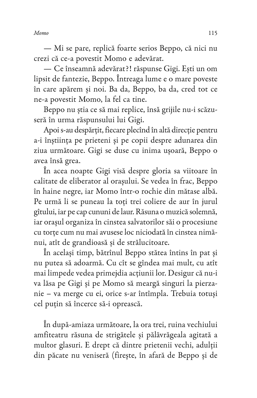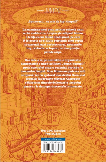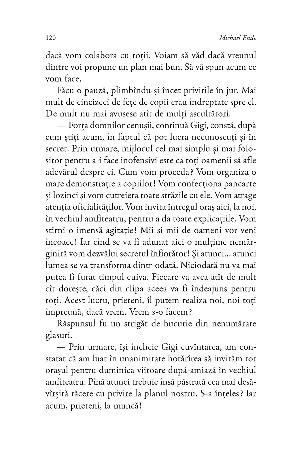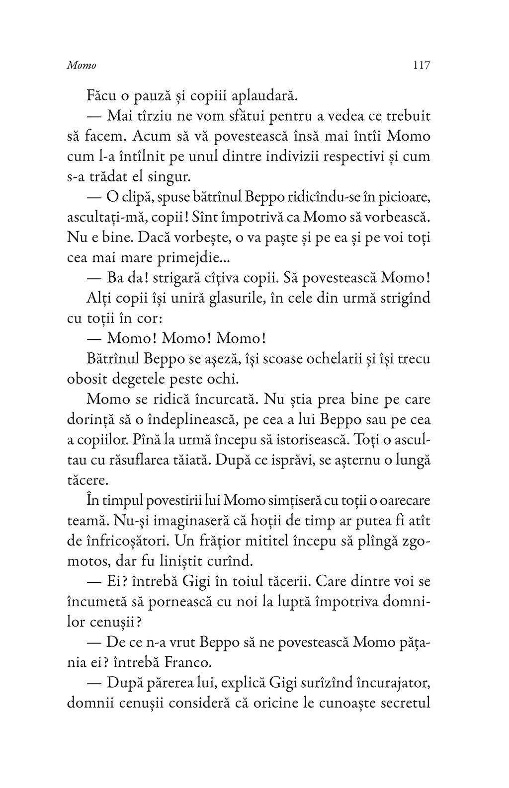 Dar intr-o zi, pe nesimtite, o organizatie fantomatica a unor terifianti „domni cenusii” preia controlul asupra orasului, furindu-le oamenilor timpul. Doar Momo are puterea sa li se opuna, iar cu ajutorul maestrului Hora si al ciudatei lui broaste-testoase Casiopeea calatoreste dincolo de hotarele timpului pentru a le descoperi secretele intunecate.