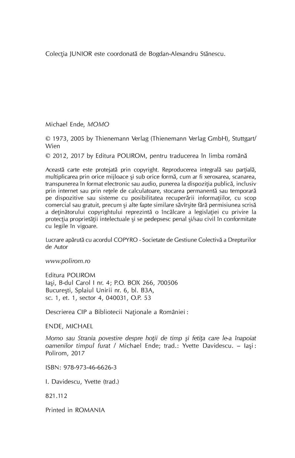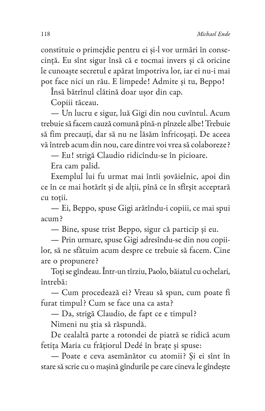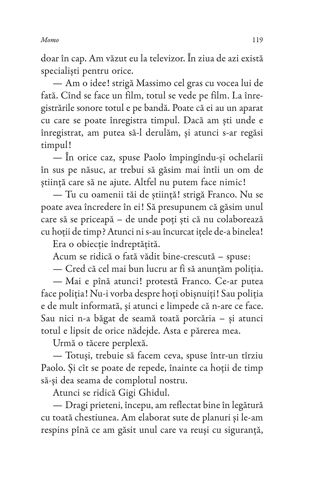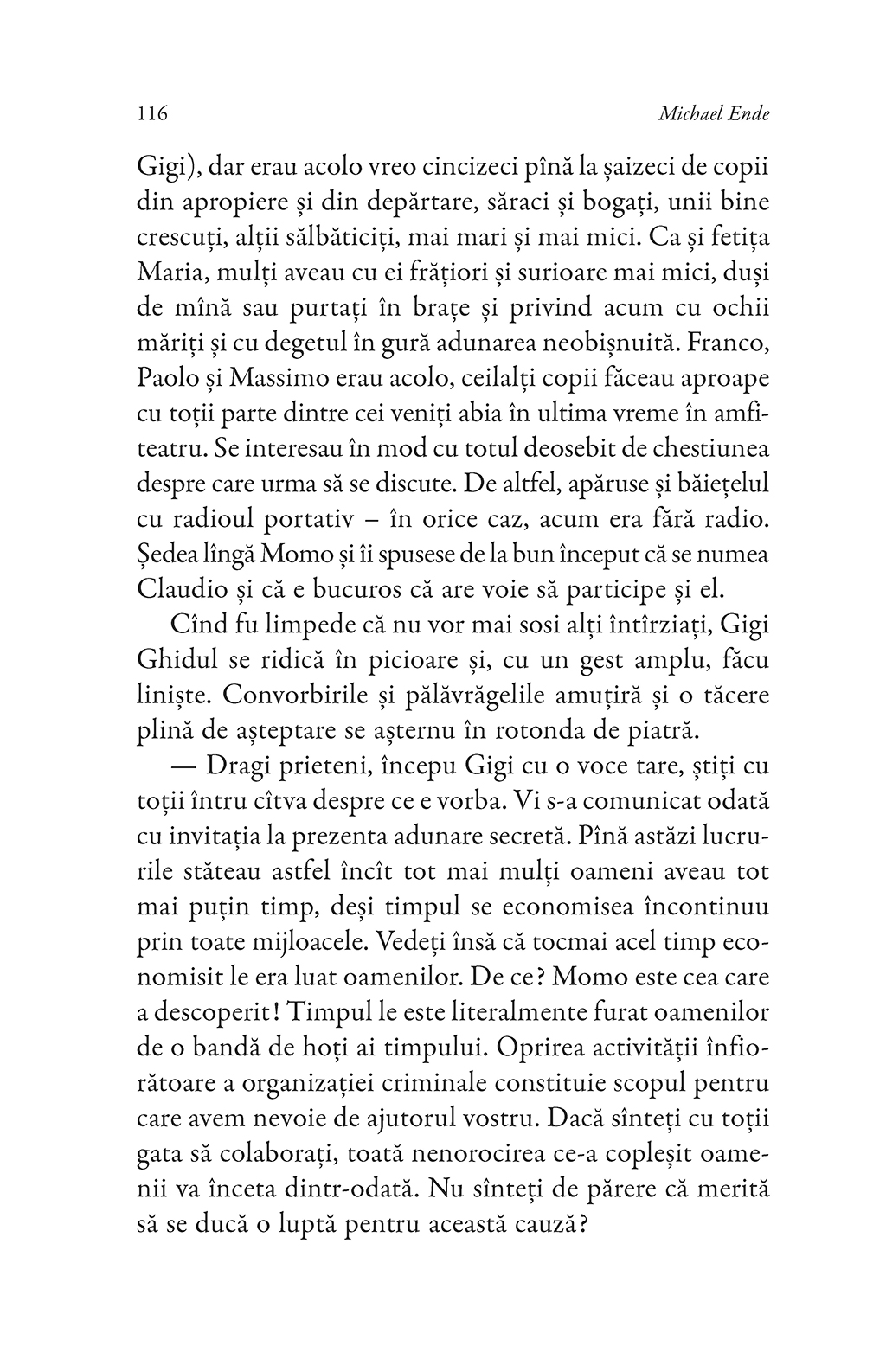 Dar intr-o zi, pe nesimtite, o organizatie fantomatica a unor terifianti „domni cenusii” preia controlul asupra orasului, furindu-le oamenilor timpul. Doar Momo are puterea sa li se opuna, iar cu ajutorul maestrului Hora si al ciudatei lui broaste-testoase Casiopeea calatoreste dincolo de hotarele timpului pentru a le descoperi secretele intunecate.