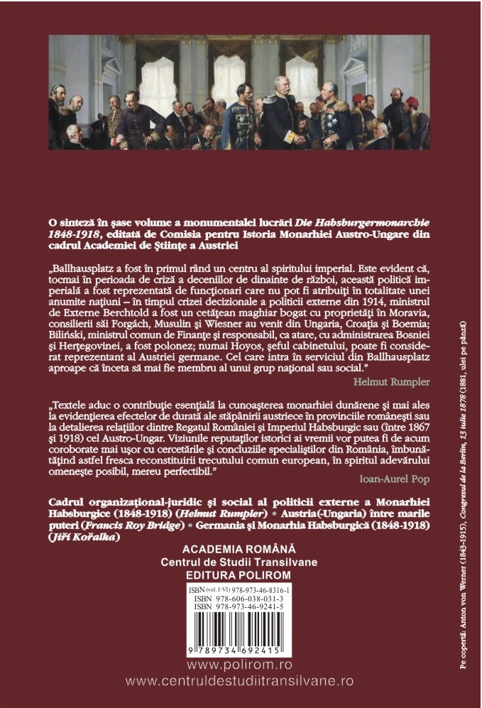 „Textele aduc o contribuție esențială la cunoașterea monarhiei dunărene și mai ales la evidențierea efectelor de durată ale stăpânirii austriece în provinciile românești sau la detalierea relațiilor dintre Regatul României și Imperiul Habsburgic sau (între 1867 și 1918) cel Austro-Ungar. Viziunile reputaților istorici ai vremii vor putea fi de acum coroborate mai ușor cu cercetările și concluziile specialiștilor din România, îmbună-tățind astfel fresca reconstituirii trecutului comun european, în spiritul adevărului omenește posibil, mereu perfectibil.” (Ioan-Aurel Pop). Coeditare cu Academia Română, Centrul de Studii Transilvane