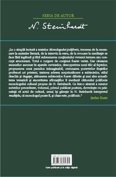 „La o simpla lectura a textelor Monologului polifonic, trecerea de la recenzare la amintire literara, de la interviu la eseu, de la evocare la meditatie se face fara legatura si fara subsumarea continutului vreunui termen sau concept structurant. Totul e curgere de continut foarte variat. Dar cautarea sensurilor ascunse in spatele cuvintelor, descoperirea unui tilc al faptelor, propunerea unui paradox inimaginabil, creionarea portretelor ilustrilor profesori ori prieteni, tratarea adesea surprinzatoare a subiectelor, stilul deschis si degajat, alaturarea subiectelor foarte diferite si mai ales actualitatea tematica si sinceritatea afirmatiilor ii mediaza cititorului polifonia monologului cultural propus de N. Steinhardt. Ca intr-o sinteza a tuturor scrierilor precedente, volumul, primul publicat postum, dovedeste cu prisosinta ca actul de cultura, unul, isi gaseste in N. Steinhardt interpretul multiplu, ca monologul poate fi, si chiar este, polifonic.” (Stefan Iloaie)