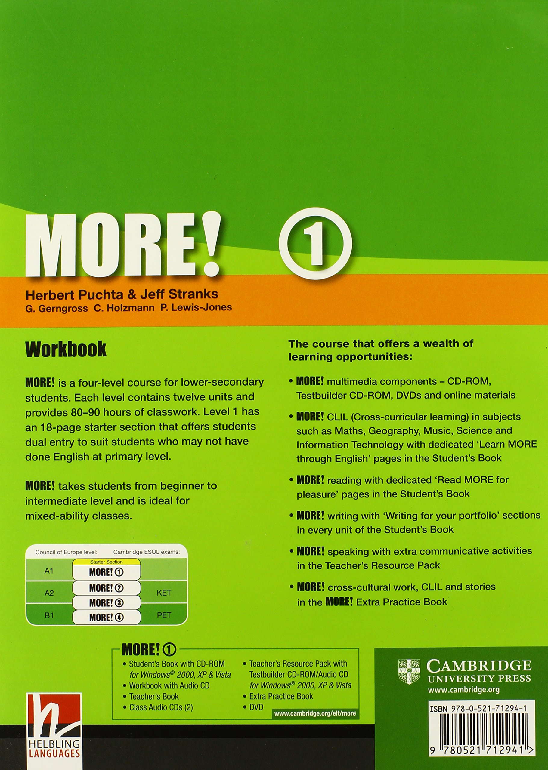 MORE! is a four-level course from a highly respected author team that's bursting with features for lower secondary students. Each level of MORE! contains 80-90 hours of class material. With dedicated reading, culture, grammar, vocabulary, skills and cross-curricular learning sections, plus a wide range of flexible components, you really do get more with MORE! The Workbook with Audio CD contains exercises for extra practice in reading, vocabulary, listening, grammar, and a 'Writing for your Portfolio' section.