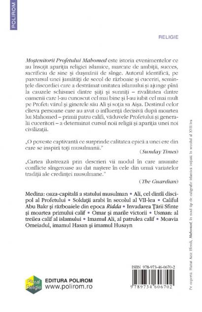 Mostenitorii Profetului Mahomed este istoria evenimentelor ce au insotit aparitia religiei islamice, marcate de ambitii, succes, sacrificiu de sine si dusmanii de singe. Autorul identifica, pe parcursul unei jumatati de secol de razboaie si cuceriri, semintele discordiei care a destramat unitatea islamului si ajunge pina la cauzele schismei dintre siiti si sunniti - rivalitatea dintre oamenii care l-au cunoscut cel mai bine si l-au iubit cel mai mult pe Profet: varul si ginerele sau Ali si sotia sa Aisa. Destinul celor citeva persoane care au avut o influenta decisiva dupa moartea lui Mahomed - primii patru califi, vaduvele Profetului si generalii cuceritori - a determinat cursul noii religii si aparitia unei noi civilizatii.