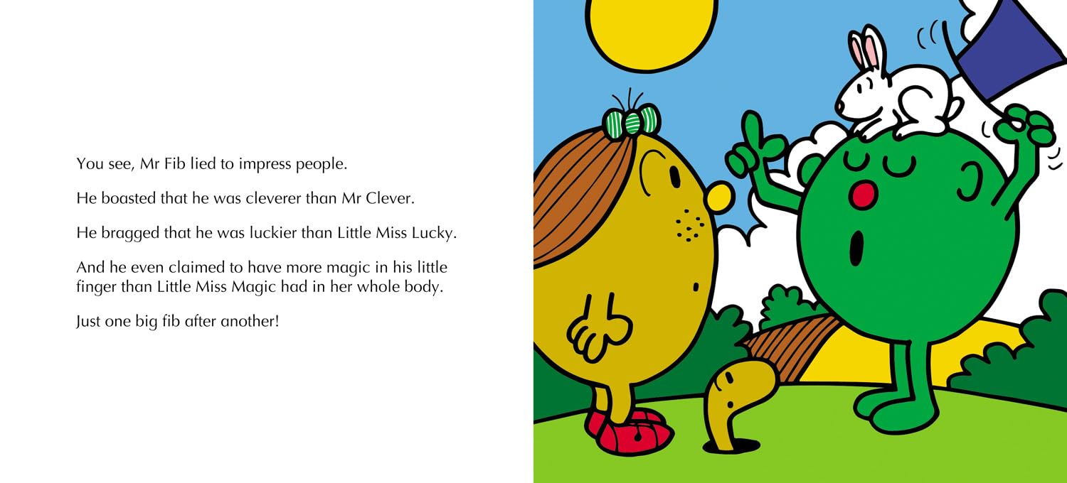 Mr Fib is the smartest, strongest and funniest Mr Men of all. Well, so he says, but don't believe everything you hear! Mr Fib fibs to impress people, but his fibs are getting bigger and bigger, and one day he goes too far and his friends are upset. Can Mr Fib learn to tell the truth?