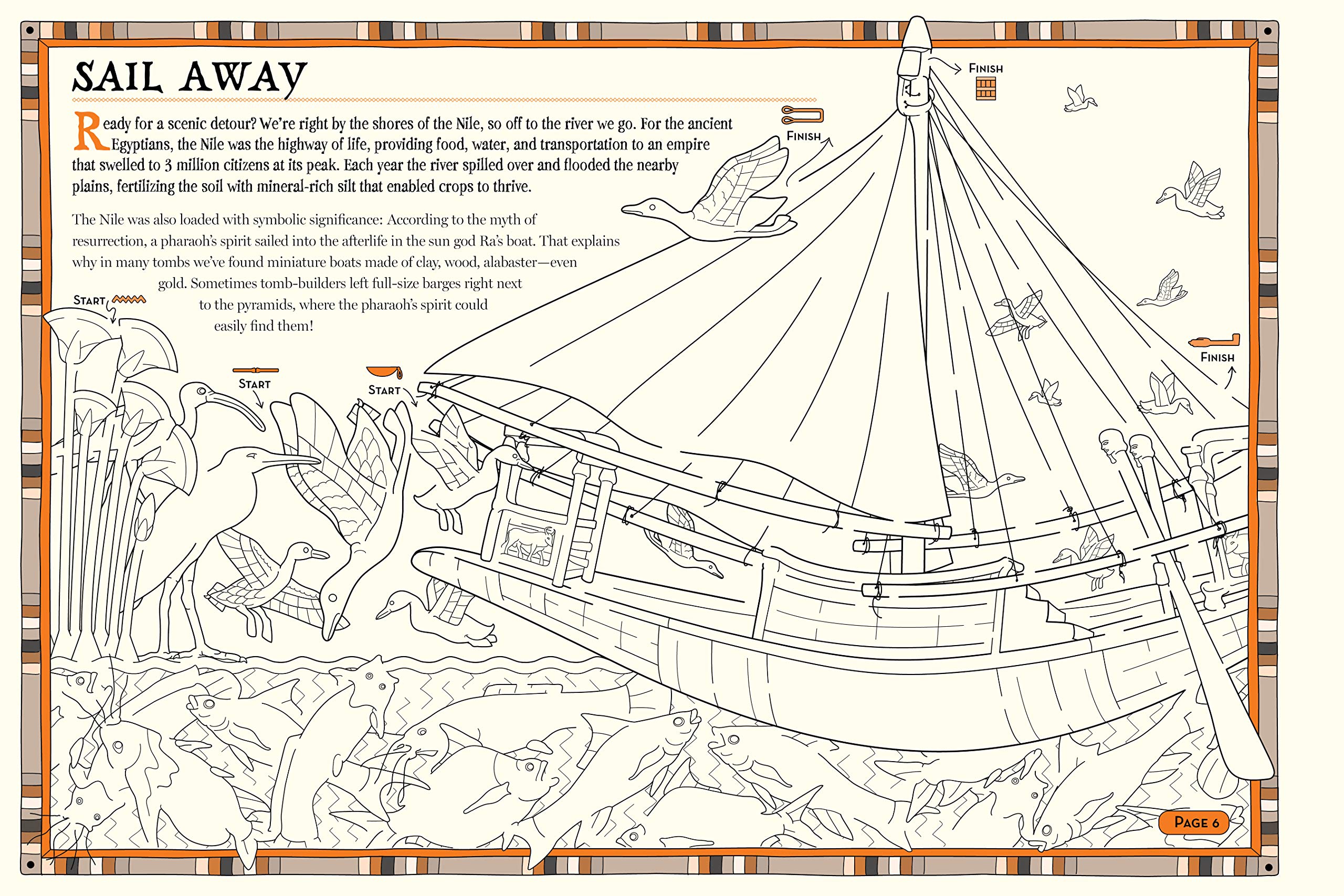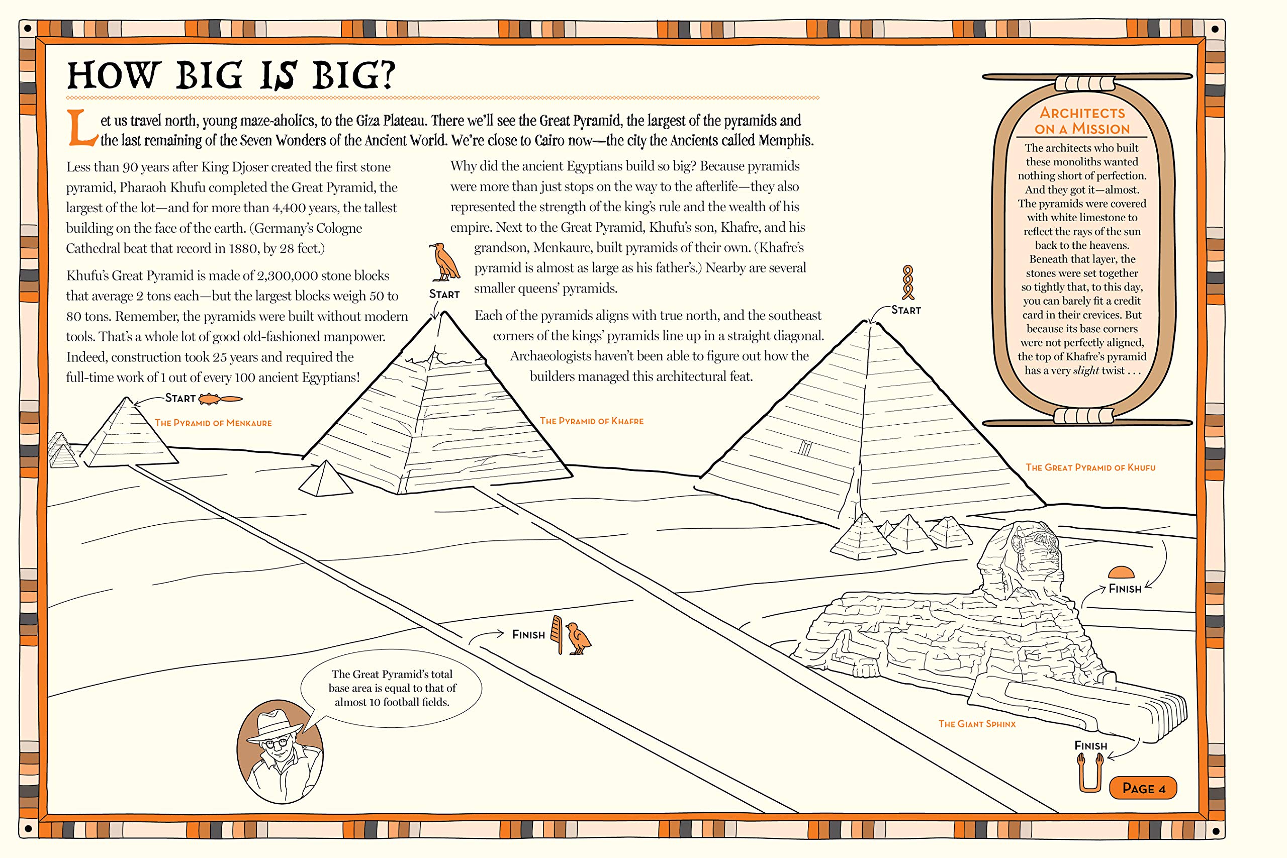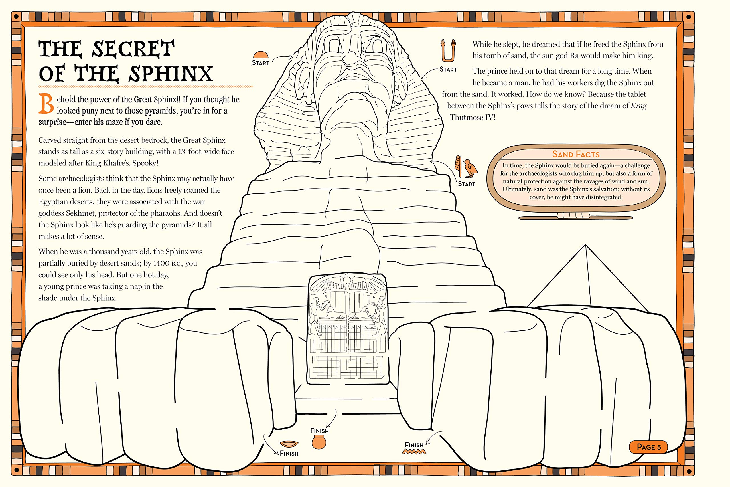 Written and drawn by Elizabeth Carpenter, MUMMY MAZES is ingeniously designed to open up to 28 poster-size pages-these are deliciously big mazes, the kind kids will pore over for hours. There are mummies, monuments, and intricate murals, ancient gods and the Pharaoh's mask, scarabs, an Egyptian night sky, and the Giant Sphinx who guards the pyramid complex at Giza. The meticulously drawn mazes lead kids through hieroglyphics, cracks in the limestone, detailed wall paintings, and more. Adding to the fun, each maze is linked by an adventure-the reader joins Professor Archie Ologist on an expedition from the Colossi of Memnon into the heart of long-lost tombs, learning along the way about the cat-goddess Bastet, why both men and women wore wigs, and how much linen it sometimes took to wrap an important mummy (three miles' worth!). Once all the mazes are completed, there's a hieroglyphic puzzle to solve at the end-and then the whole doubles as a colouring book. The pages are perforated to tear, colour, and then display on the wall.